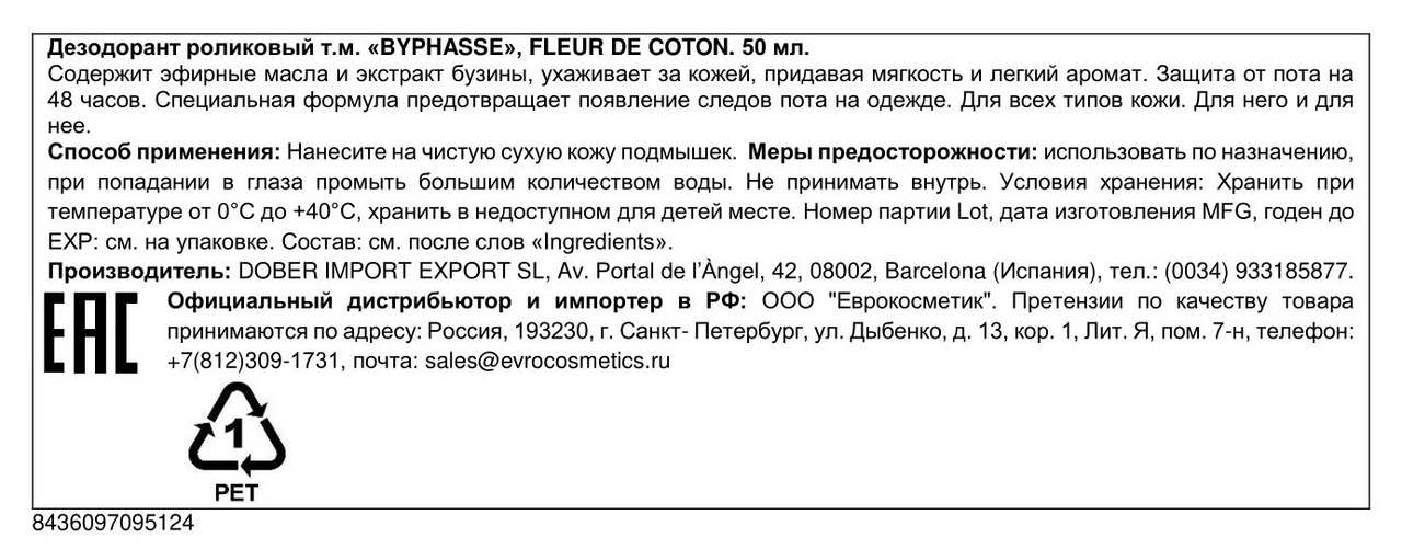Дезодорант Byphasse Fleur De Coton роликовый, 50мл