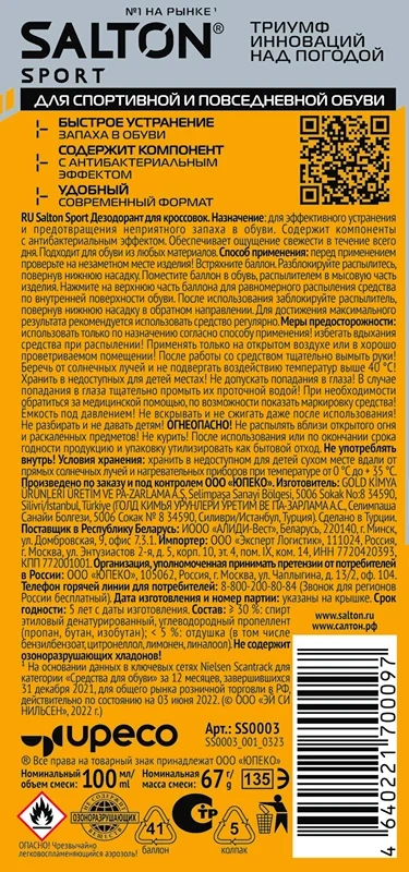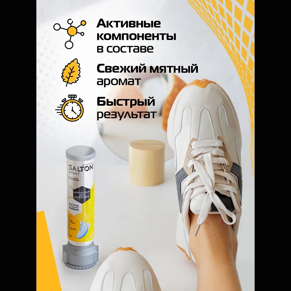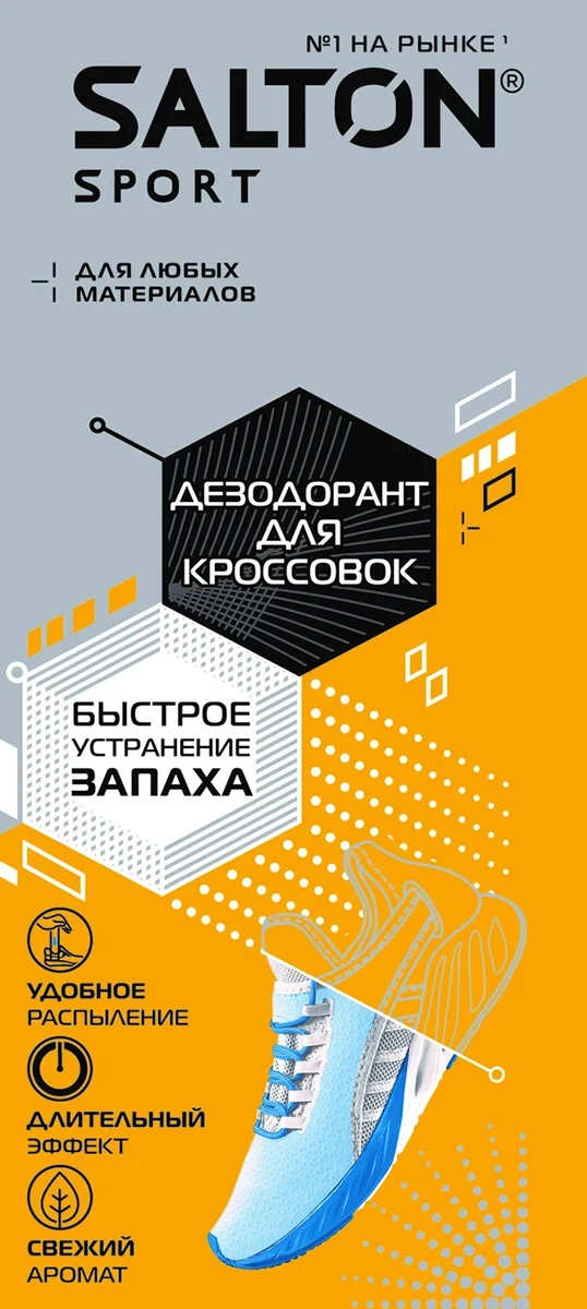 Дезодорант специально разработан, чтобы бороться с неприятными запахами, возникающими в результате активного использования спортивной обуви. Его уникальное двустороннее распыление позволяет обеспечить полное покрытие внутренней поверхности кроссовок, гарантируя максимальную эффективность.Как работает дезодорант Salton Sport? Его мощная формула с антибактериальным компонентом проникает глубоко в материал, эффективно нейтрализуя неприятные запахи. Специально разработанный формат удобен в применении, одним легким нажатием на верхнюю часть флакона обеспечивается равномерное распределение дезодоранта внутри всей поверхности кроссовок, даже в труднодоступных местах. Вы можете быть уверены, что ваша обувь останется свежей на протяжении всего дня.Дезодорант также обладает приятным ароматом, который освежает обувь и придает ей приятную нотку свежести. Он быстро высыхает, не оставляя следов или пятен, поэтому вы можете быть уверены в его незаметности после применения. Он безопасен для различных типов материалов, таких как кожа, текстиль, синтетика и другие.Воспользуйтесь дезодорантом Salton Sport для кроссовок с двусторонним нижним распылением и позвольте вашей обуви оставаться свежей как можно дольше.