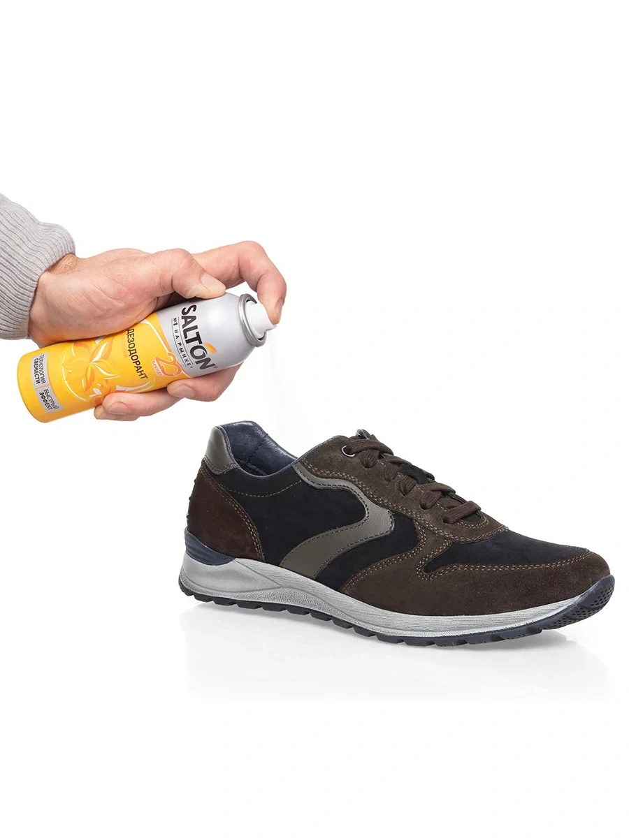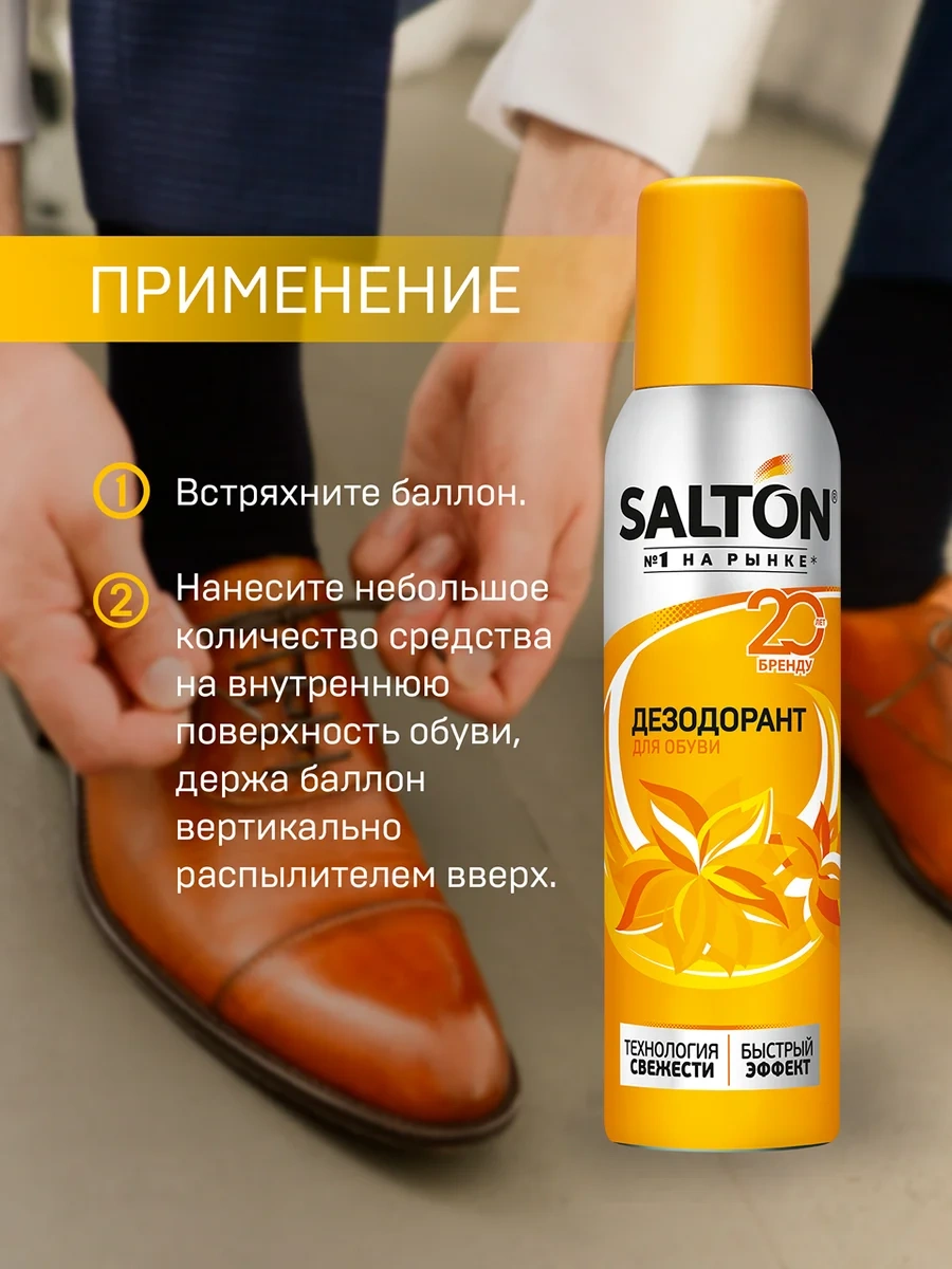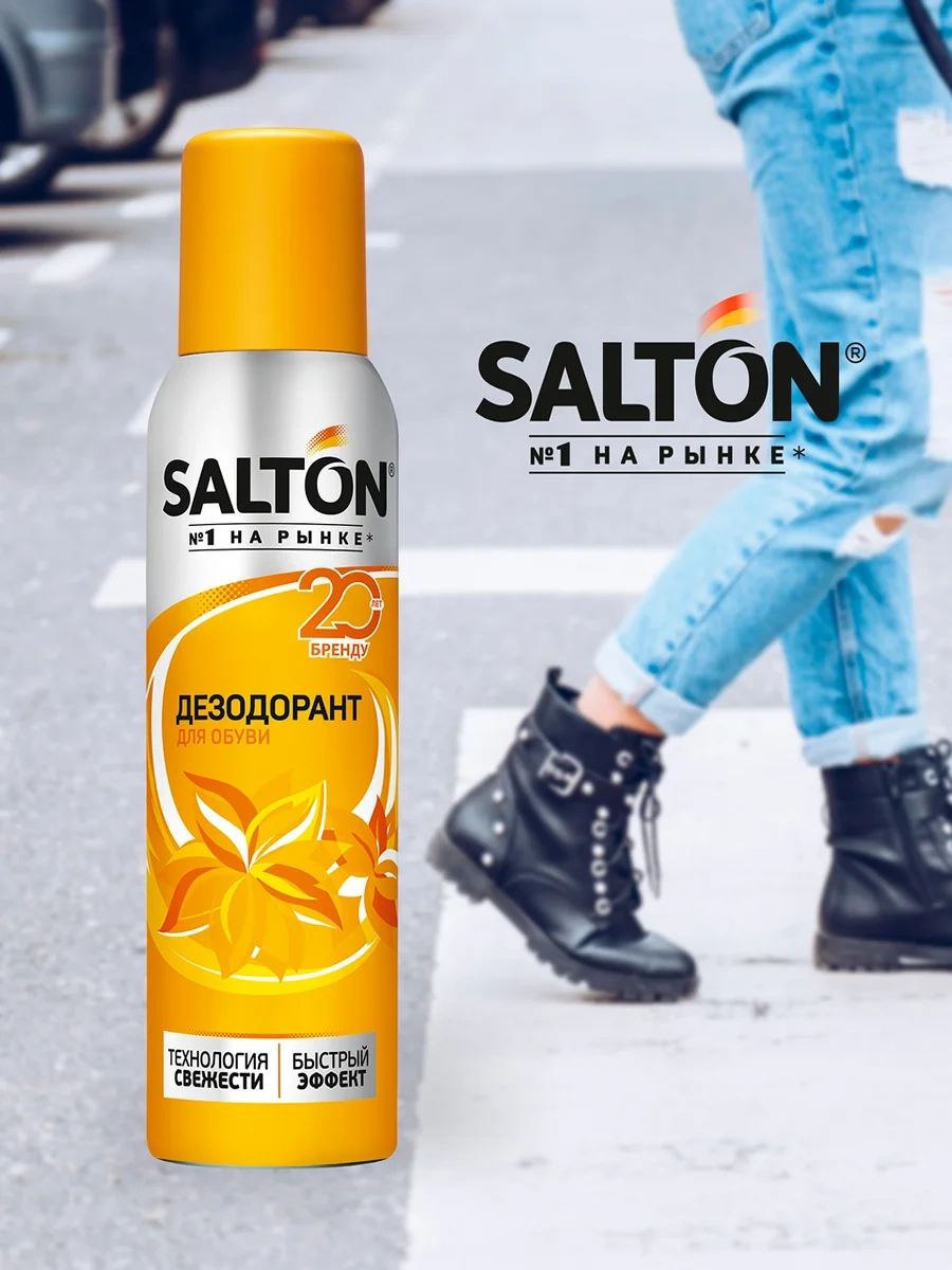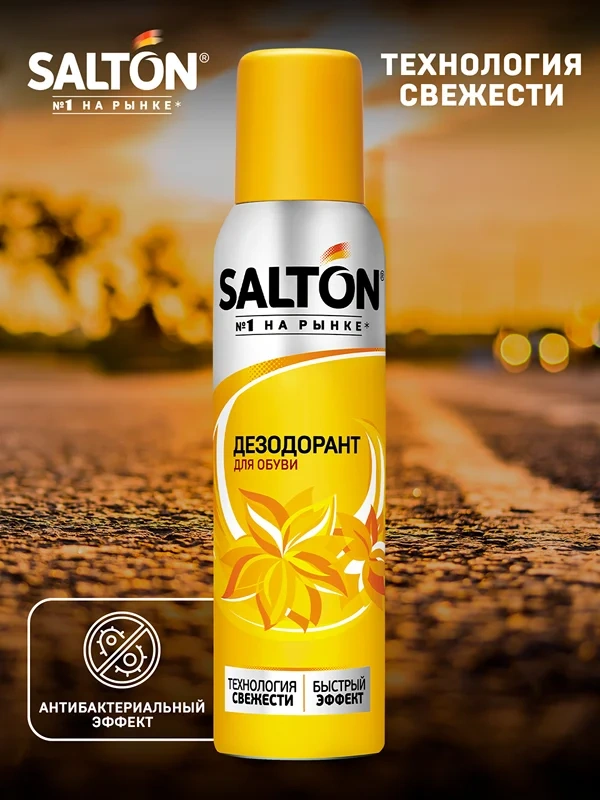 Дезодорант для обуви Salton нейтрализует и предотвращает неприятный запах. Обладает антибактериальным действием и обеспечивает ощущение свежести в течение дня. Подходит для любой обуви. Объём: 150 мл. Состав: менее 5%: вода, отдушка, антибактериальный компонент; более 30%: растворитель, пропан, бутан.