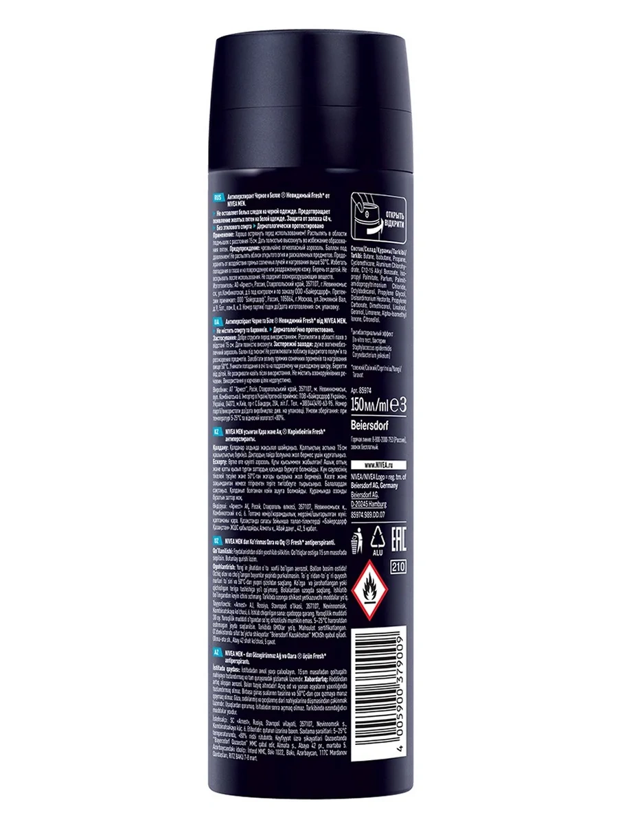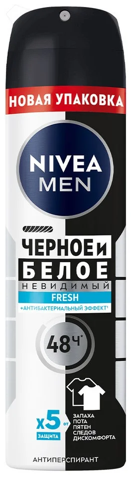 Дезодорант-антиперспирант спрей Nivea Черное и Белое Невидимый Fresh предотвращает появление белых пятен на темной одежде и желтых пятен на светлой. Черная одежда остается черной, а белая одежда дольше остается белой. Уникальная формула имеет 5 факторов защиты от: запаха, пота, пятен, следов и раздражения. Защищает кожу подмышек от неприятного запаха в течение 48 часов и обладает антибактериальным эффектом, который препятствует размножению бактерий, вызывающих неприятный запах. Не содержит этилового спирта. Настоящий мужской аромат для ощущения чистоты и свежести на весь день. Сильная защита и забота о коже от Nivea на каждый день!