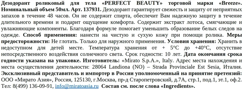 Роликовый дезодорант-антиперспирант Breeze Perfect Beauty разработан специально для женщин, которые ценят надежность и качество. Благодаря инновационной формуле, он обеспечивает длительную защиту от пота и неприятного запаха на протяжении всего дня. Вы можете быть уверены, что Ваша одежда останется свежей и чистой даже после активного физического напряжения. Шариковый дезодорант подходит для использования на любых участках тела – подмышками, на ногах и даже на детской коже. Его нежная текстура легко наносится и быстро впитывается, не оставляя следов и пятен на одежде. Вы можете быть уверены, что Ваша кожа будет оставаться сухой и ухоженной в любых условиях. Дезодорант не содержит спирта и протестирован дерматологами.