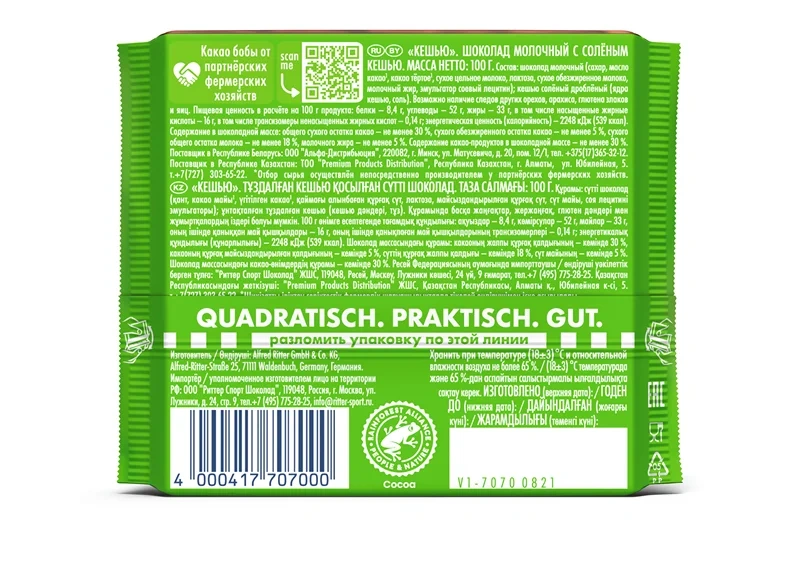 Шоколад Ritter Sport молочный кешью, 100г
