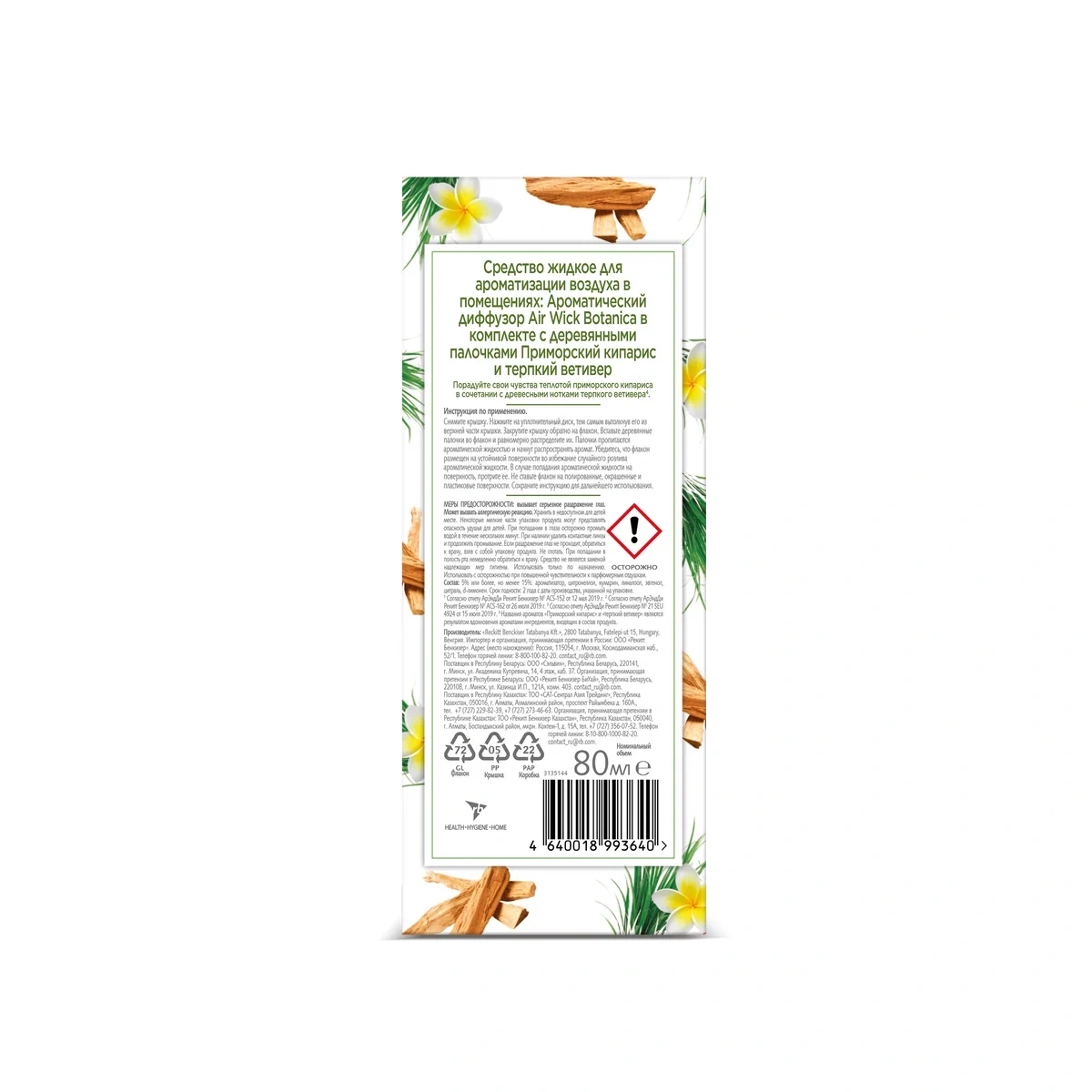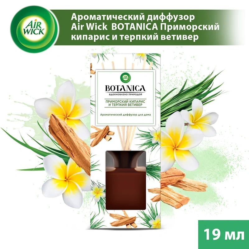 В набор входит стеклянный флакон с ароматической жидкостью и палочки из ротанга. Жидкость содержит ароматическую композицию (в том числе бензил бензоат, кумарин, гераниол, гидроксицитронеллаль, D-лимонен, линалоол) и растворитель.