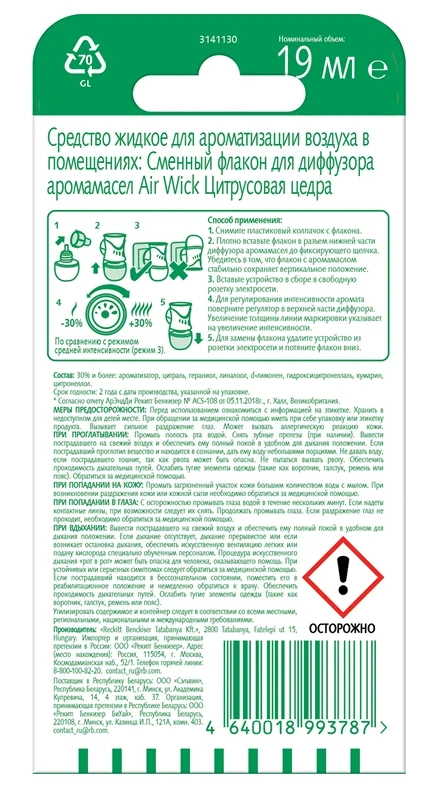 Ароматизатор не выделяет токсичных веществ, что делает его безопасным для здоровья. Полностью готов к использованию: достаточно открыть флакон и опустить в него палочки. Интенсивность аромата можно регулировать, добавляя или уменьшая количество палочек. При необходимости перевернуть палочки во флаконе для усиления запаха.