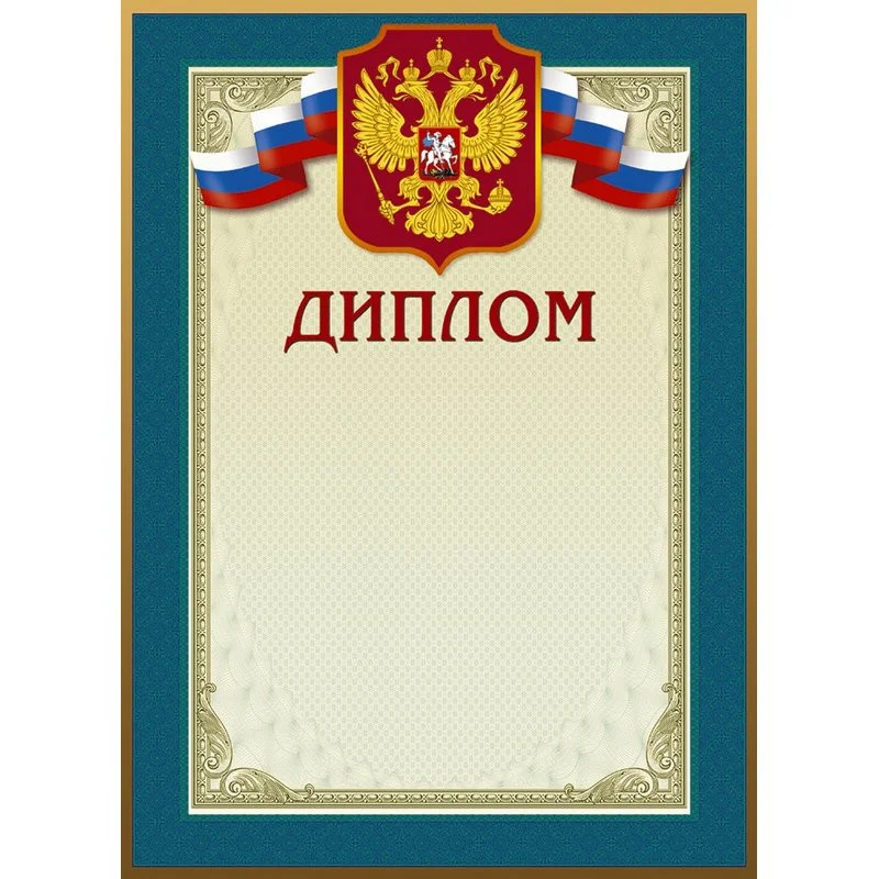 Диплом А4 230 г/кв. м с тиснением фольгой (10 штук в упаковке, 46/Д). Бланк выполнен в классическом стиле, имеет голубую рамку и светло-бежевый фон с узором. Сверху расположен триколор и герб, напечатанный золотой фольгой, слово Диплом — красной. Предназначен для награждения за заслуги в учебе, спорте, трудовой деятельности, а также для выражения признательности и благодарности сотрудникам, коллегам и партнерам. Он отпечатан на полиграфическом мелованном картоне плотностью 230 г/кв. м. Размер — 210×290 мм позволяет напечатать на нем текст с помощью стандартного принтера. В упаковке 10 шт. в термоусадочной пленке.