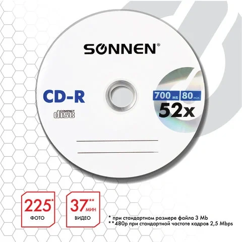 CD-R диски для однократной записи цифровой информации. Поставляются в термоупаковке (Bulk). Тип диска: CD-R. Емкость диска: 700 Mb. Скорость записи: 52 x. Количество дисков в упаковке: 50.