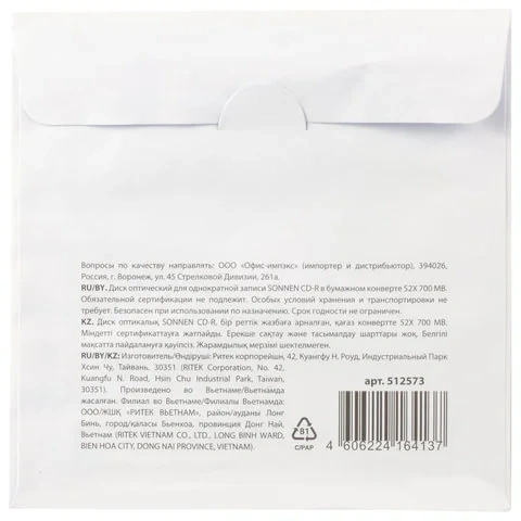 Диск CD-R Sonnen 700Mb, 52x, бумажный конверт, 1шт/уп