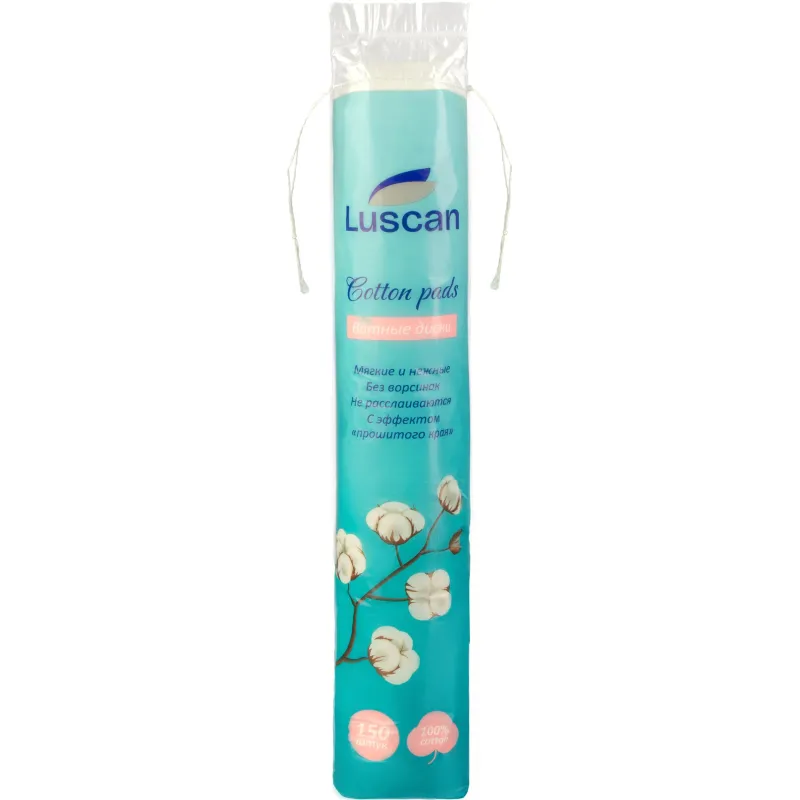 Диски ватные Luscan 150 штук в упаковке. Мягкие и нежные ватные диски Luscan предназначены для косметических и гигиенических целей. Благодаря эффекту «прошитого» края ватные диски не расслаиваются при использовании. У ватных дисков две поверхности — поверхность с тиснением «соты» обеспечивает более глубокое очищение, гладкая поверхность без тиснения обеспечивает деликатное нанесение косметических средств на кожу. Удобная перфорация на упаковке позволяет легко доставать ватные диски перед использованием.