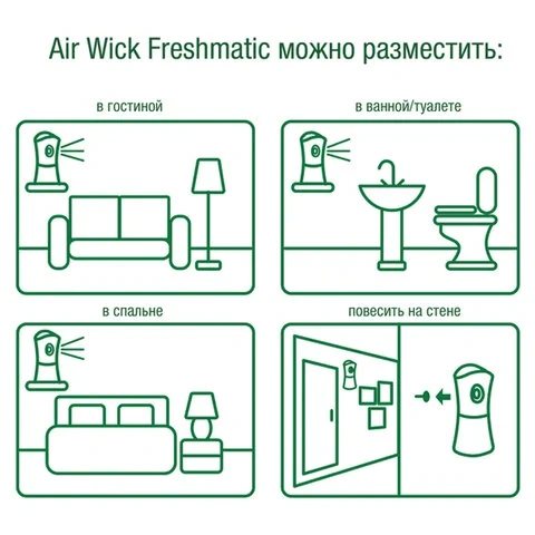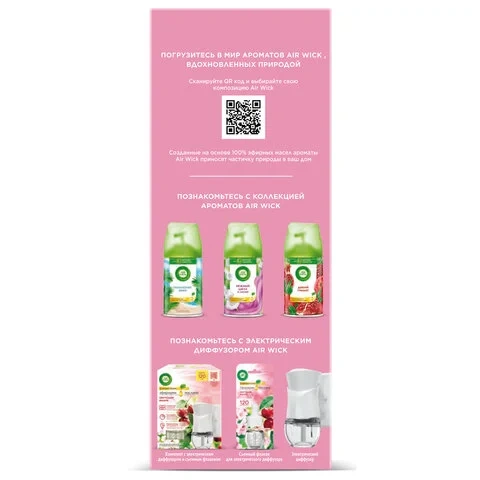 Air Wick Freshmatic PURE, Автоматический аэрозольный освежитель воздуха в комплекте со сменным баллоном Цветущая вишня, 250 мл. Просто вставьте аэрозоль в держатель, и Air Wick Freshmatic будет автоматически распылять свежий и легкий аромат в Вашем доме, радуя вас и ваших близких. Яркая палитра многослойных ароматов поможет создать в доме неповторимую атмосферу. Основные характеристики: - Избавляет от неприятных запахов и наполняет ваш дом приятным ароматом - Три режима интенсивности распыления аромата - До 60 дней свежести - 1 спрей освежает целую комнату - Удобно вешать на стену, размещать на полке или ставить на шкаф - Многослойный аромат. Избавляет от неприятных запахов и наполняет дом приятным ароматом До 60 дней свежести. Состав: 30% и более: бутан, пропан, этиловый денатурированный спирт; менее 5%: ароматизатор. Храните в недоступном для детей и животных месте. Используйте только по назначению. Внимательно прочтите меры предосторожности к сменному аэрозолю. Перед тем, как ставить аэрозоль, проверьте, что диспенсер выключен. Не направляйте в лицо при включении или при установке интервала распыления. Используйте только щелочные батарейки. Никогда не используйте батарейки разных типов или производителей. Используйте только с диспенсером Air Wick Freshmatic. Перед тем, как вставить аэрозоль, проверьте, что диспенсер выключен.. 1) Откройте диспенсер, повернув против часовой стрелки верхнюю часть устройства. Вставьте сменный баллон в нижнюю часть диспенсера. Закройте диспенсер, совместив верхнюю и нижние части и повернув верхнюю часть по часовой стрелке. 2) Откройте верхнюю часть устройства, потянув крышку вверх. 3) Вставьте 2 батарейки согласно обозначениям (+) и (-) . 4) Установите на регуляторе временной интервал распыления. 5) Не направляйте устройство в лицо.
