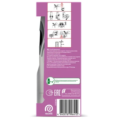 Автоматический освежитель воздуха Air Wick Freshmatic+сменный балон Нежный шелк и лилия 250 млНазначение/особенности: Автоматический освежитель воздуха Air Wick Freshmatic — это небольшое стильное устройство, которое автоматически борется с неприятными запахами день за днем. Аромат «Нежный шелк и лилия» наполнит Ваш дом изысканными нотками цветущей лилии и нежного шелка. Вставьте сменный баллон в элегантное устройство, выберите интенсивность распыления и наслаждайтесь утонченным ароматом Air Wick, разработанным парфюмерными домами Европы. До 70 дней непрерывной свежести. Удобно вешать на стену, размещать на полке или ставить на шкаф. Нормальное функционирование автоматического распылителя гарантировано при использовании сменного баллона Air Wick Freshmatic. Материал корпуса — пластик, цвет — белый. Габаритные размеры — 193×80×80 мм. Состав набора: — Автоматический распылитель воздуха. — Сменный баллон «Нежный шелк и лилия». — 1 батарейка АА. Способ применения: Снимите верхнюю часть изделия, потянув крышку вверх. Переключите контроллер на позицию «Выкл.», как показано на рисунке. Откройте верхнюю часть изделия. Вставьте сменный аэрозольный баллон в нижнюю часть изделия. Закройте изделие, соединив верхнюю и нижнюю части и повернув верхнюю часть по часовой стрелке. Вставьте 1 аккумуляторную батарею АА согласно символам (+) и (—). Установите уровень интенсивности распыления ароматизирующего вещества на контроллере. Не направляйте изделие в лицо. Распыление начнется автоматически через 15 секунд. Максимальная площадь ароматизируемого помещения — 10 м²Меры предосторожности: Беречь от солнечных лучей, избегать нагревания выше 50°С. Беречь от источников воспламенения/нагревания/искр/открытого огня. Не курить. Не распылять вблизи открытого огня или других источников воспламенения. Не нарушать целостности упаковки и не сжигать, даже после использования. Не разбирать и не давать детям. При попадании в глаза: Осторожно промыть глаза водой в течение нескольких минут. Снять контактные линзы, если Вы ими пользуетесь и, если эт легко сделать. Продолжить промывание глаз. При необходимости обратиться за медицинской помощью, по возможности показать упаковку/маркировку продукта. Использовать только по прямому назначению. Не вдыхать аэрозоль. Использовать с осторожностью при повышенной чувствительности к парфюмерным отдушкам. Освежители воздуха не являются заменой надлежащих мер гигиены. Использовать только в хорошо проветриваемых помещениях. Более полная информация по безопасному обращению химической продукции находится в паспорте безопасности. Состав баллона: 30% и более: пропеллент (смесь: Пропан, Бутан), этиловый денатурированный спирт; менее 5%: ароматизирующие добавки, в том числе бензилсалицилат, цитраль, гексилциннамаль, лимонен, линалоол. Условия хранения: Хранить в недоступном для детей и животных месте. Срок годности: 24 месяца.