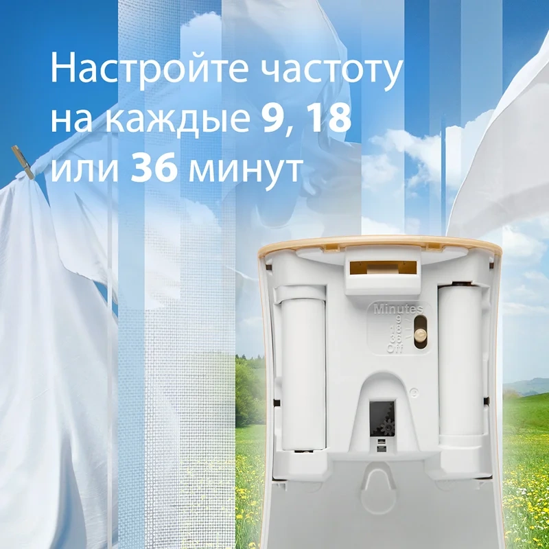 • УСТАНОВИТЕ ТАЙМЕР: выберите 1 из 3 настроек (9, 18 или 36 минут), чтобы установить интервал автоматического распыления.