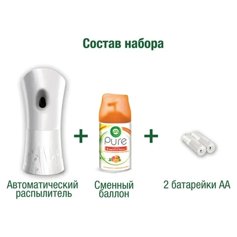 Комплект автоматический распылитель + сменный баллон 250мл, 2 батарейки. 3 уровня интенсивности аромата. Продукты Airwick универсальны в использовании: они подходят для ароматизации любых помещений (ванной комнаты, туалета, прихожей,спальни, гостиной, салона автомобиля). Освежитель автоматический Airwick специально разработан, чтобы обеспечивать приятный аромат в помещении. Освежитель обеспечит приятный аромат около 70 дней, его отдушки содержат компонент, устраняющий запах табака.