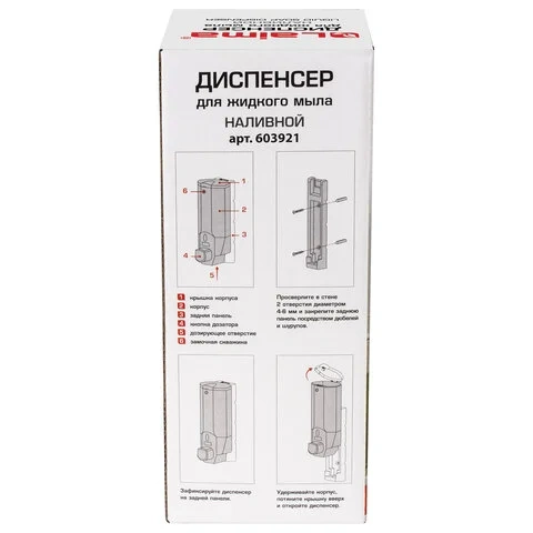 Корпус выполнен из ударопрочного пластика ABS. Выдача мыла осуществляется экономичными порциями. Диспенсер сочетается с расходными материалами других производителей. Имеется окно для контроля уровня мыла. В комплект входят крепежные материалы.