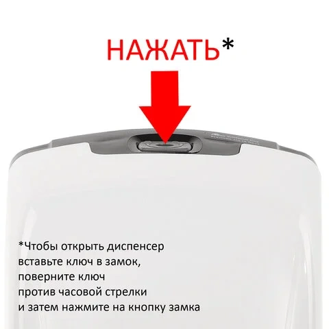 Чтобы открыть диспенсер, вставьте ключ в замок, поверните ключ против часовой стрелки и затем нажмите на кнопку замка.