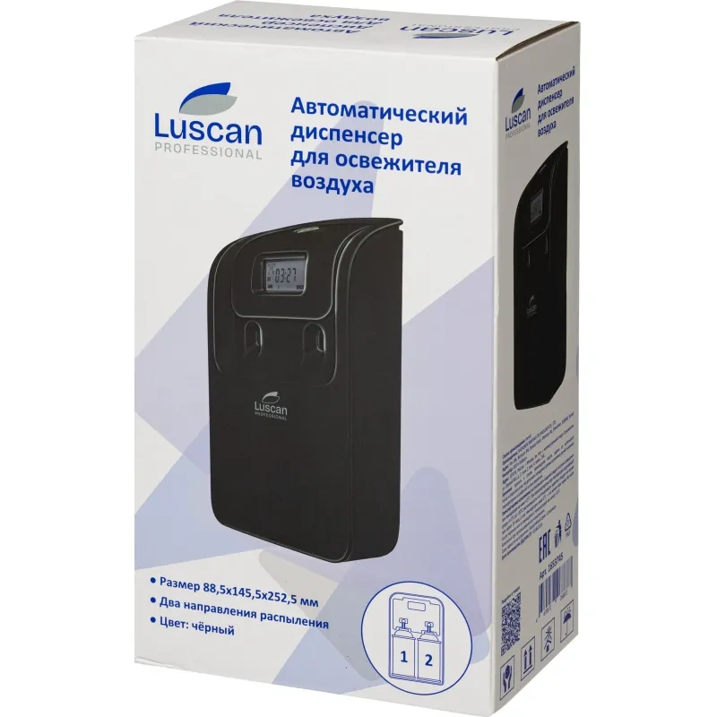 Автоматический диспенсер для освежителя Luscan Professional предназначен для аэрозольных освежителей и подходит для всей линейки сменных баллонов Luscan. Диспенсер идеально впишется в любой интерьер туалетных комнат. В диспенсере можно одновременно использовать 1 или 2 сменных баллона, которые могут работать вместе или попеременно. Для работы диспенсера нужны 2 батарейки АА. Обращаем ваше внимание, что батарейки не идут в комплекте. Диспенсер рассчитан на 3200 распылений и единовременную ароматизацию помещения площадью до 120 м. Автоматически выставляется интервал впрыска: 7, 5, 15 или 30 минут. Освежитель может работать как в круглосуточном режиме, так и в 12 — часовом режиме. Есть замок. Срок службы одного баллончика — 3 месяца. Размер диспенсера: 88,5×145,5×252,5 мм. Материал: ABS-пластик, полипропилен. Цвет: чёрный. Вид крепления: настенное. Страна-изготовитель: Китай. Гарантийный срок: 1 год.