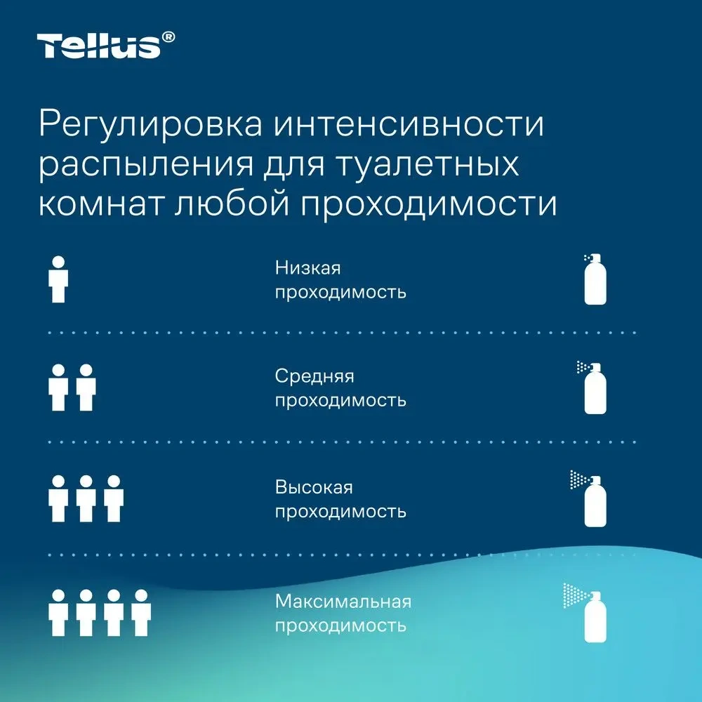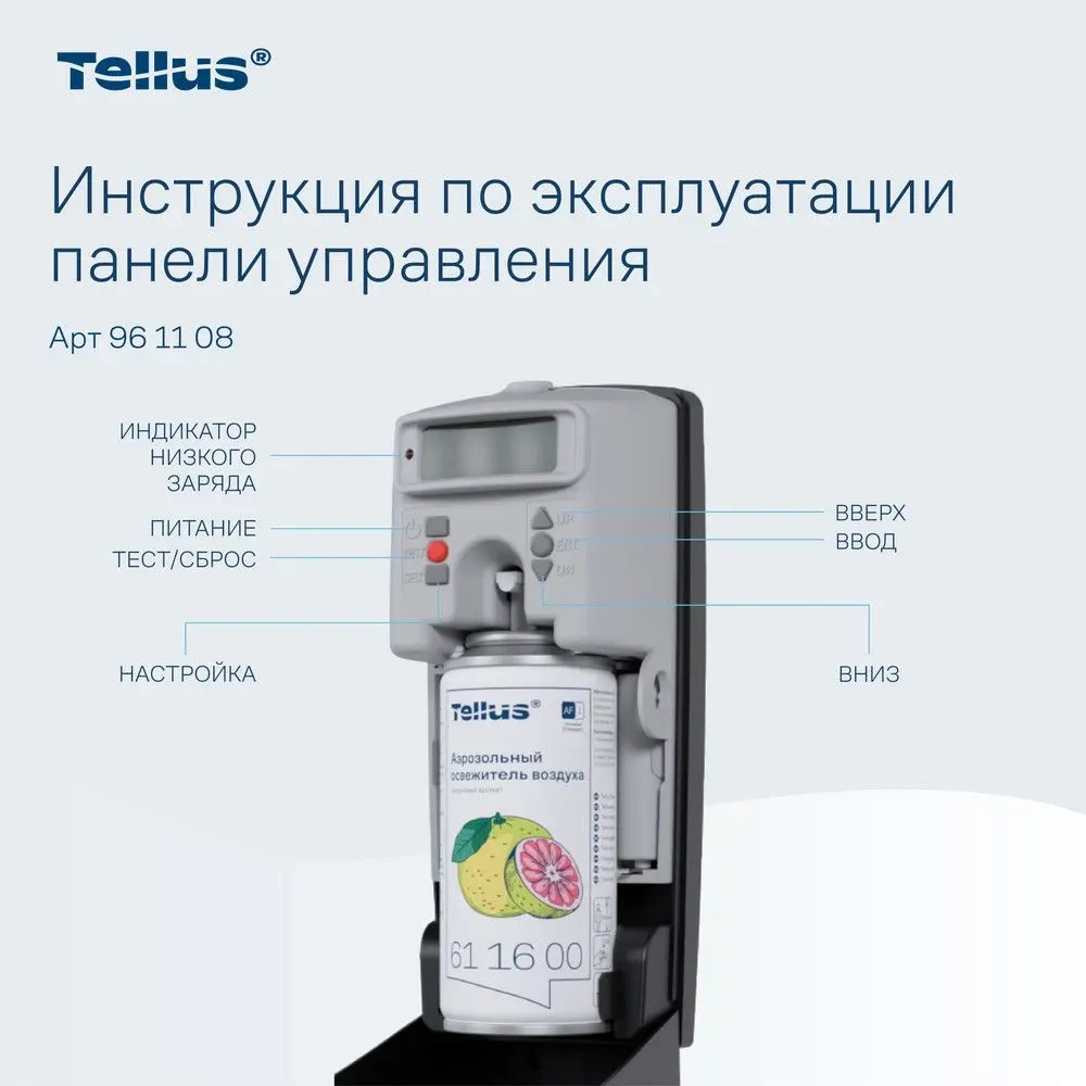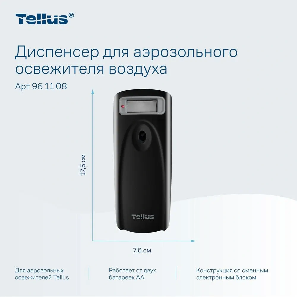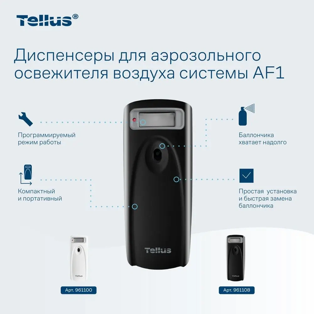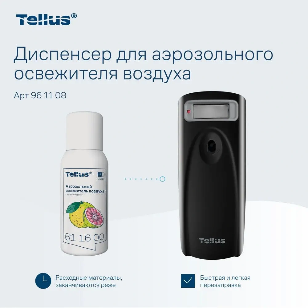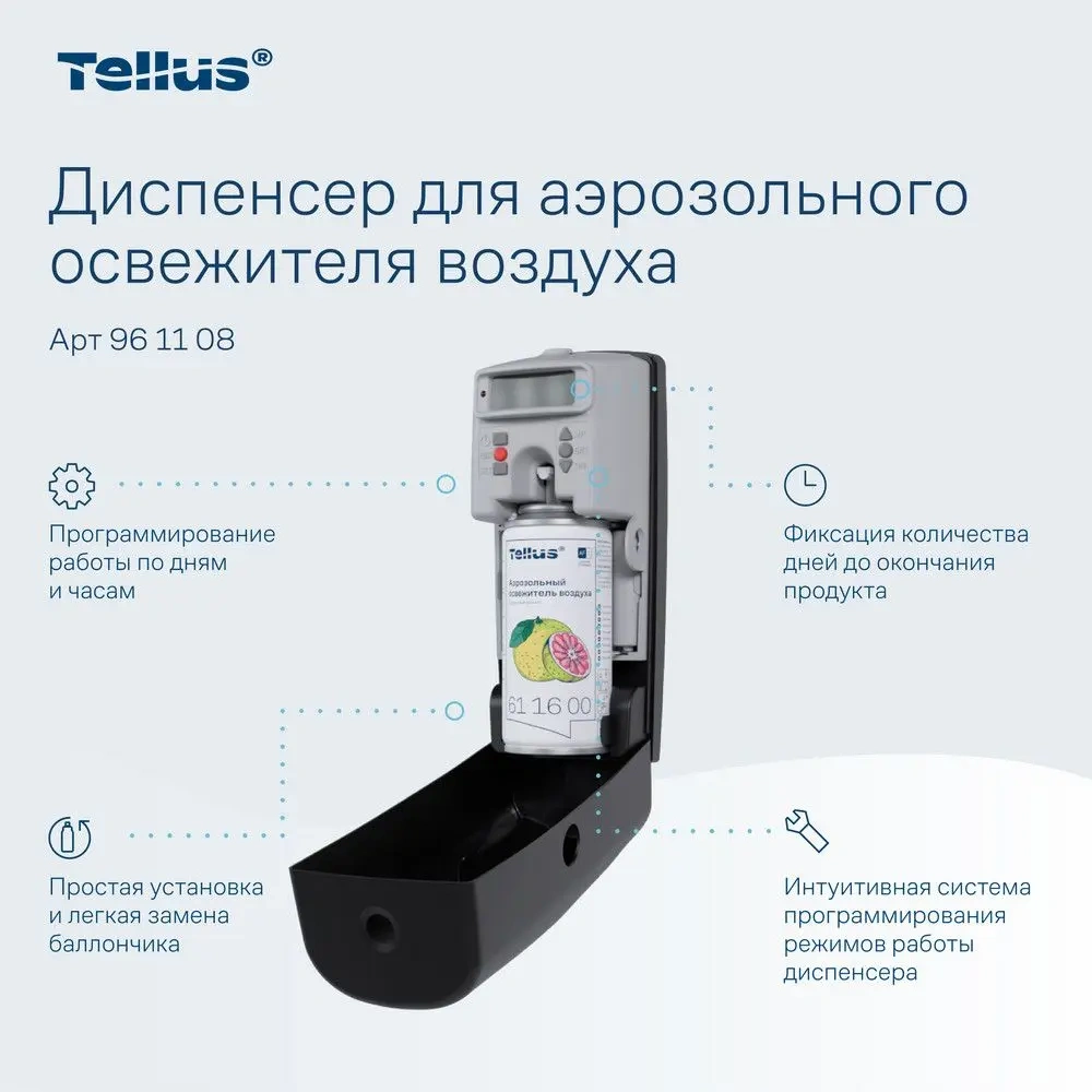 Диспенсер для аэрозольного освежителя воздуха Tellus — это современное решение для поддержания свежести и комфорта в любых помещениях. Благодаря своим функциональным возможностям и стильному дизайну, он идеально подходит для туалетных комнат с любым уровнем проходимости, будь то офисные здания, гостиницы, рестораны или торговые центры.