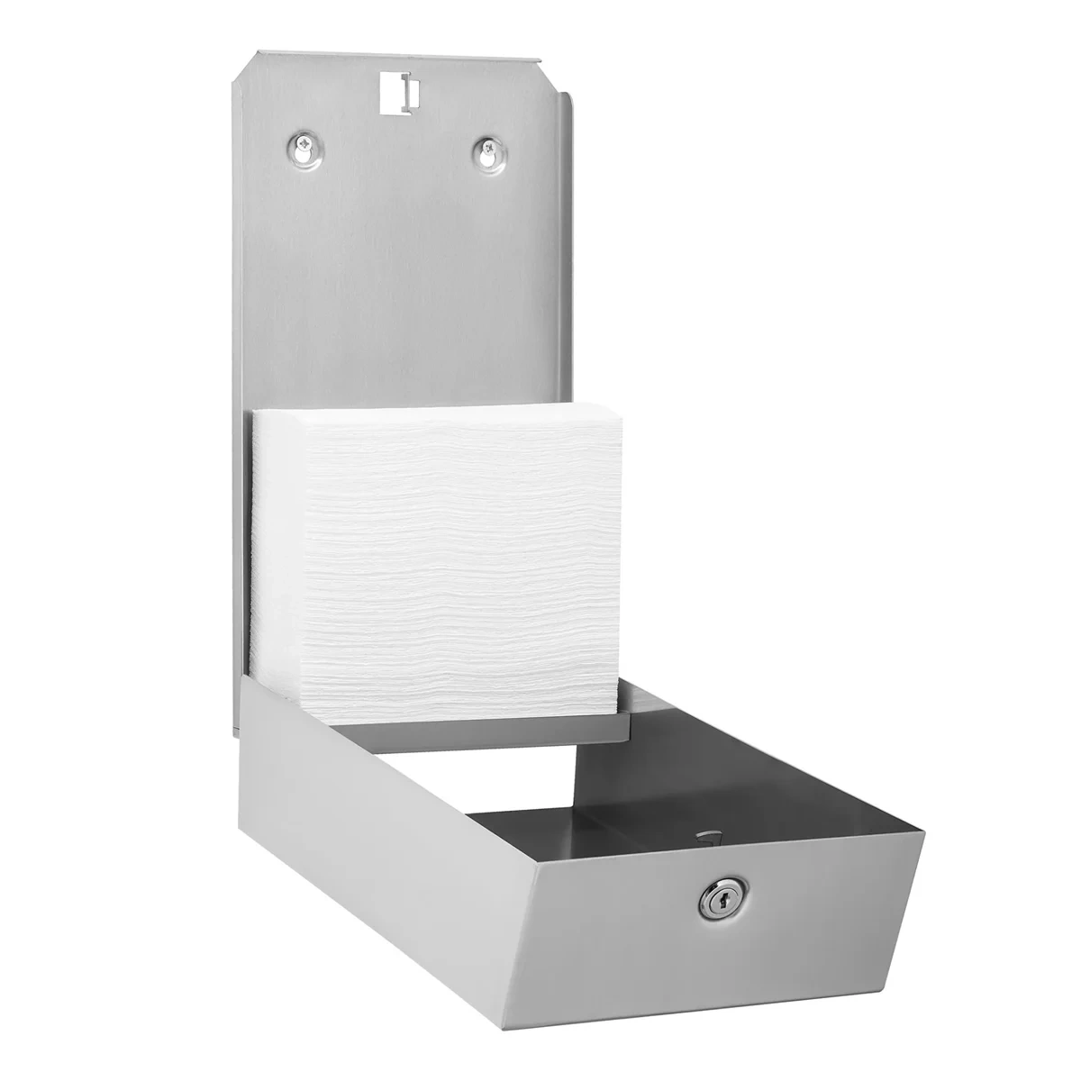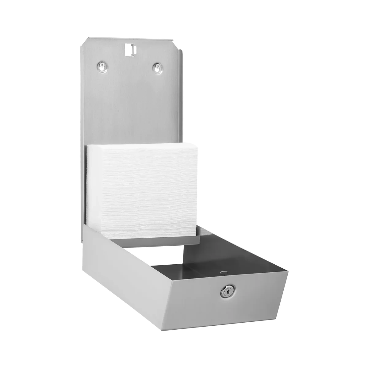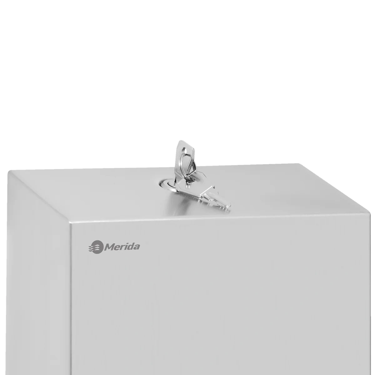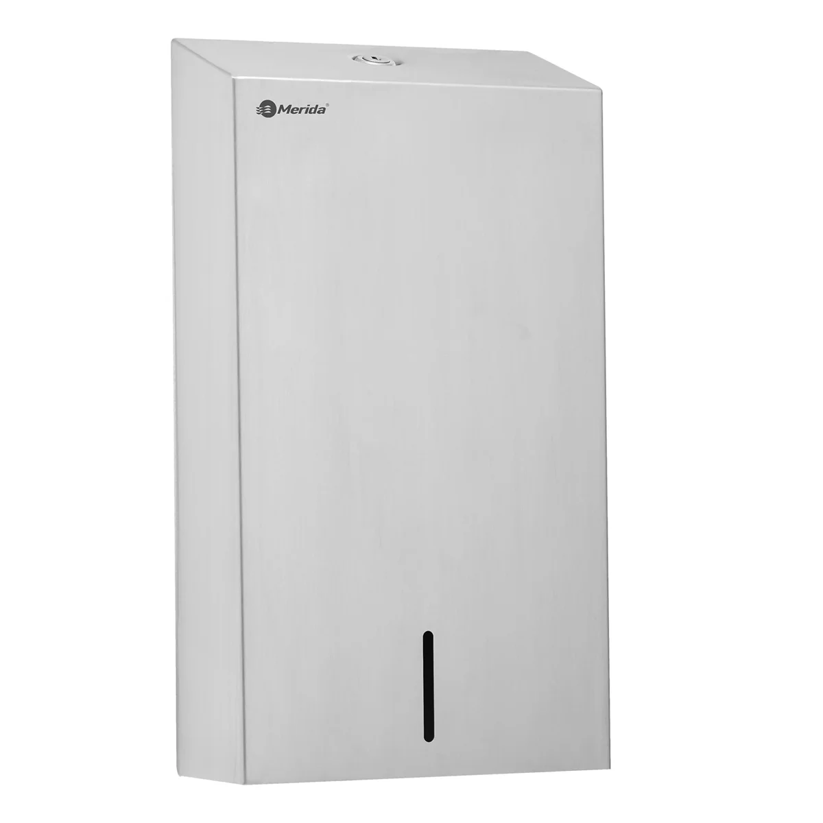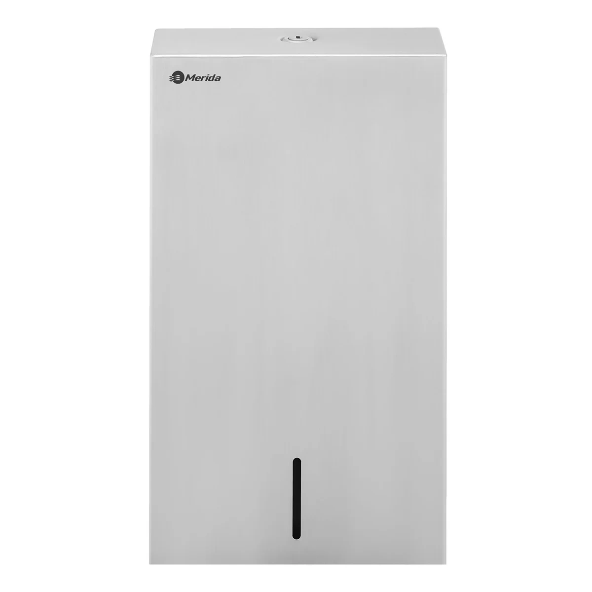 Диспенсер для бумажных полотенец в листах Z-сл. MERIDA STELLA R СЛИМ изготовленный из нержавеющей стали AISI 304 толщиной 1 мм, он обеспечивает надежность и долговечность. Диспенсер вмещает 2 пачки полотенец, что позволяет сократить частоту пополнения.