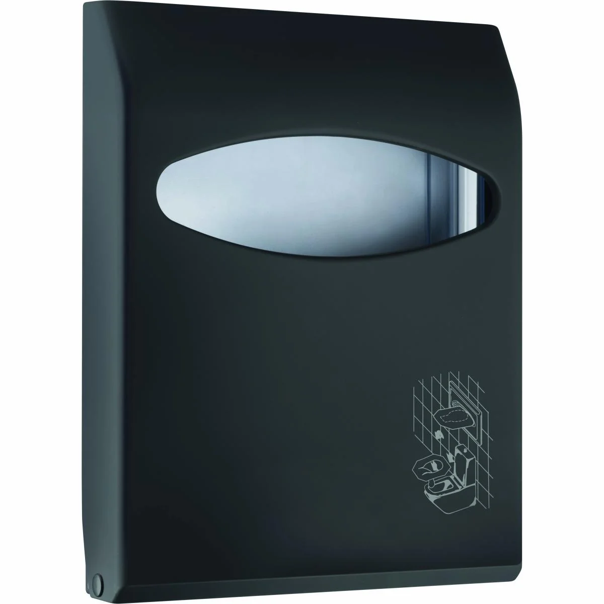 Диспенсер для накладок на туалет чёрный серии Black выполнен из качественного ABS пластика черного цвета. Стильный черный диспенсер для накладок на унитаз (полиэтиленовых сидений артикул OC-2-100 1/4), предназначен для ресторанов, кафе и прочих мест со средней проходимостью, которые желают подчеркнуть свой изысканный и индивидуальный стиль, поскольку он выполнен из особого вида ABS - пластика черного цвета, матового оттенка. Компактный и стильный диспенсер для накладок на унитаз предназначен для использования совместно с небольшими туалетными покрытиями. Для больших накладок имеются другие модели (12029 и 04026.B). В коробке с этим устройством вы найдете универсальный ключ, который подходит для всех устройств серии Black, а также комплект для установки диспенсера на стену. Гарантия на диспенсер туалетных накладок чёрный составляет 2 года!