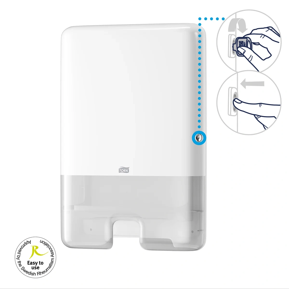 Ультратонкий компактный стильный диспенсер Торк (Tork) из ударопрочного ABS-пластика. Вмещает 2,5 пачки бумажных полотенец шириной до 21 см, сложенных двойным зигзагом ZZ. Использование данного типа полотенец обеспечивает экономичный расход, лист разворачивается полностью при отборе из диспенсера Торк (Tork). Бесконтактная система обеспечивает высокий уровень гигиены. Диспенсер для листовых полотенец подходит для помещений, в которых особое внимание уделяется комфорту и гигиене — например, в ресторанах, офисах и медицинских учреждениях. Открывается с помощью ключа или нажатием на кнопку. Внутри предусмотрено место для визитной карточки и уровнемер для быстрого монтажа.