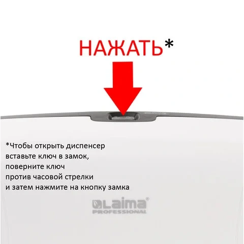 ВНИМАНИЕ! Чтобы открыть диспенсер, вставьте ключ в замок, поверните ключ против часовой стрелки и затем нажмите на кнопку замка.
