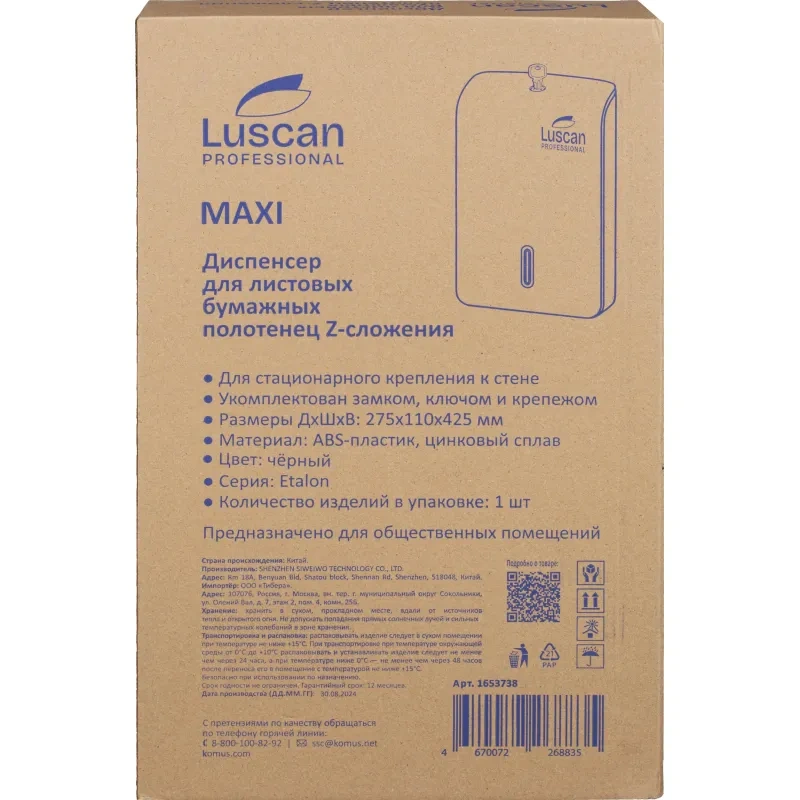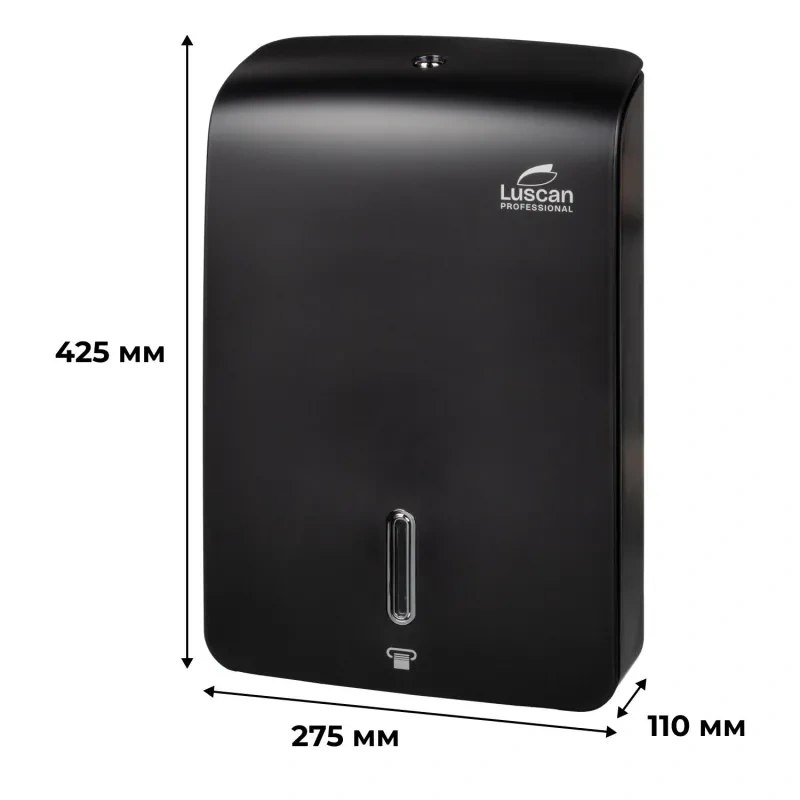 Диспенсер для листовых полотенец Luscan Professional Etalon maxi пластиковый черный Диспенсер для бумажных полотенец Z-сложения Luscan Professional Etalon maxi отлично подходит для использования в местах с высокой проходимостью таких, как туалетные комнаты в ресторанах, офисах, торговых центрах, аэропортах, железнодорожных вокзалах и т. д. Корпус диспенсера изготовлен из прочного ABS-пластика. Диспенсер обеспечивает высокий уровень гигиены и комфорта за счет того, что расходный материал находится внутри корпуса и посетитель дотрагивается только до того бумажного полотенца, которым будет пользоваться. Вместимость диспенсера 2 пачки полотенец за раз, диспенсер можно легко перезаправить в любое время. Благодаря стильному и ультратонкому дизайну подходит для любых туалетных комнат. Есть уровнеметр для быстрого монтажа и окошко для контроля за остатком расходного материала. В комплект входят крепежные материалы для установки, легкость и простота в эксплуатации гарантируют долгосрочное и надежное функционирование диспенсера. Цвет: черный. Диспенсерная система: Н2. Вид расходных материалов: листовой. Вид крепления: настенное. Страна-изготовитель: Китай. Гарантийный срок работы: 1 год. Размер диспенсера: 275×110×425 мм. Материал: ABS-пластик. Комплект поставки: диспенсер, инструкция, комплект креплений, ключ.