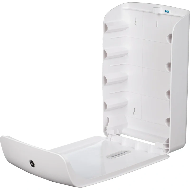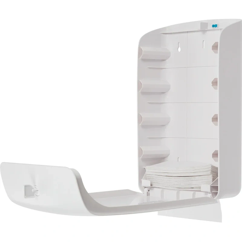Корпус диспенсера изготовлен из прочного ABS-пластика. Диспенсер обеспечивает высокий уровень гигиены и комфорта за счет того, что расходный материал находится внутри корпуса и посетитель дотрагивается только до того бумажного полотенца, которым будет пользоваться. Вместимость диспенсера 2 пачки полотенец за раз, диспенсер можно легко перезаправить в любое время.