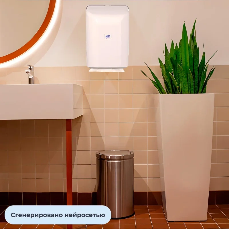 Диспенсер для бумажных полотенец в туалетах с интенсивной проходимостью: магазинах, кафе, вокзалах и т. д. Для изготовления использован высокопрочный пластик белого цвета. Подача полотенец выполняется снизу в центральной части. Предназначен для использования рулонных полотенец с перфорацией.