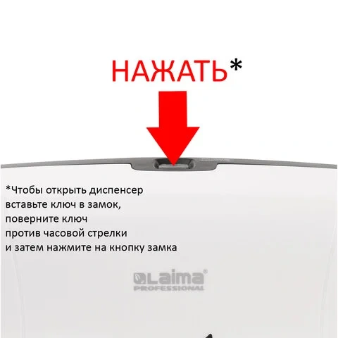 ВНИМАНИЕ! Чтобы открыть диспенсер, вставьте ключ в замок, поверните ключ против часовой стрелки и затем нажмите на кнопку замка.