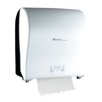 Механический автоматический диспенсер бумажных полотенец с адаптором, несмотря на свой небольшой размер подходит под большой рулон длиной 250 метров, который при отрезе каждые 24 см, обеспечивает более 1000 полотенец из рулона!
