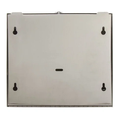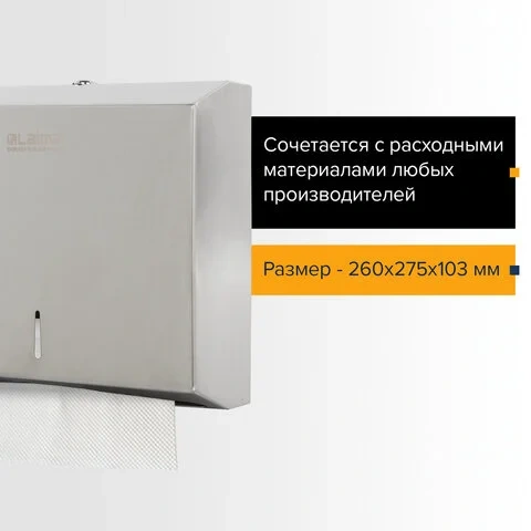 Диспенсер предназначен для подачи бумажных полотенец interfold, Z- и W-сложения. Антивандальный корпус изготовлен из нержавеющей стали. Имеется окошко для контроля остатка полотенец. Сочетается с расходными материалами других производителей. Оборудован замком с ключом. В комплект входят крепежные материалы для установки. Размер - 260х275х103 мм.