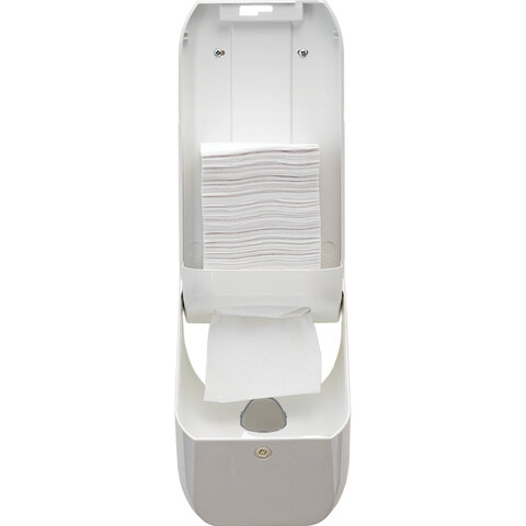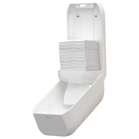 Универсальный диспенсер для листовой туалетной бумаги подходит для общественных туалетных комнат и для туалетных комнат номерного фонда. Быстрая и легкая система загрузки расходных материалов: до 2 пачек туалетной бумаги (до 500 листов).