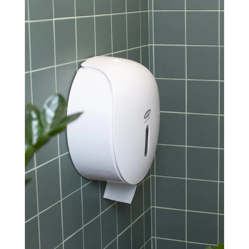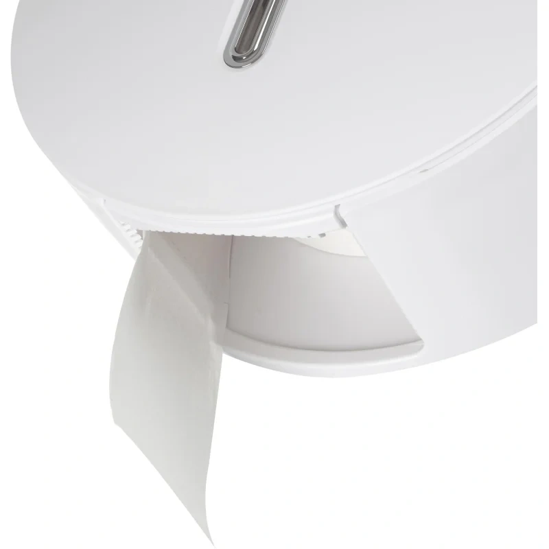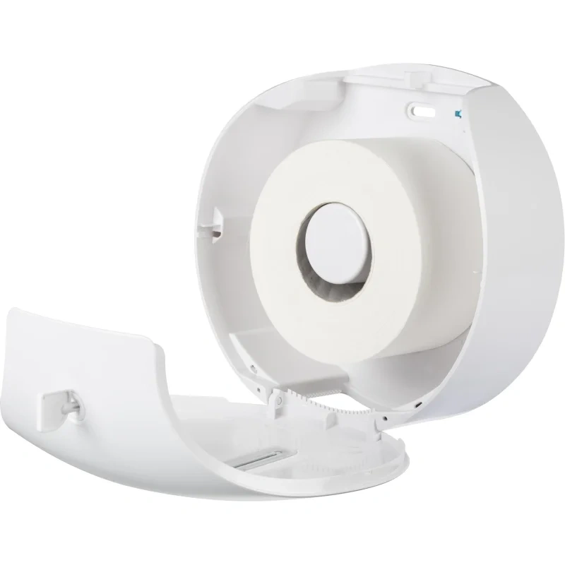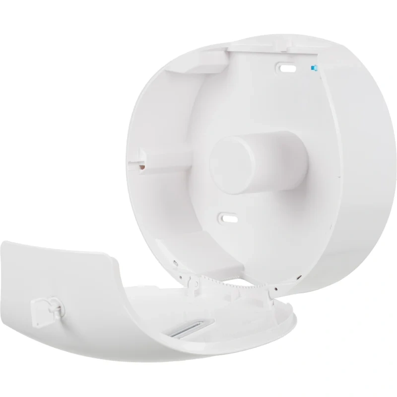 Корпус диспенсера изготовлен из прочного ABS-пластика. Для использования подойдет туалетная бумага с диаметром рулона не более 23,5 см и диаметром втулки не менее 65 мм. Закрытый внутри корпуса рулон туалетной бумаги обеспечивает высокий уровень гигиены. Большая вместимость диспенсера позволяет сокращать расходы на его обслуживание, благодаря специальному окошку удобно отслеживать наличие туалетной бумаги.