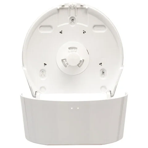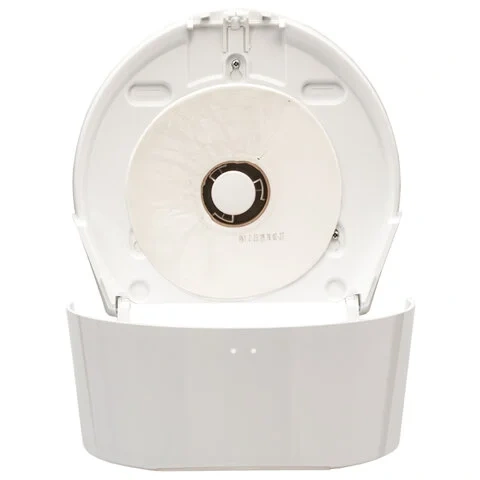 В самом диспенсере имеется переходник для вращения рулона с бумагой, что позволяет вращать рулон даже если втулка случайно помялась.В диспенсер встроен регулятор натяжения бумаги, что способствует экономному расходу бумаги