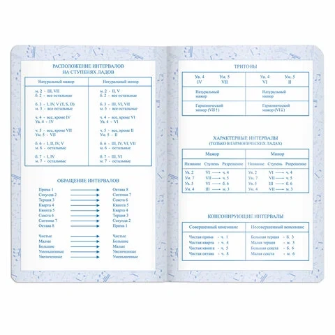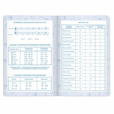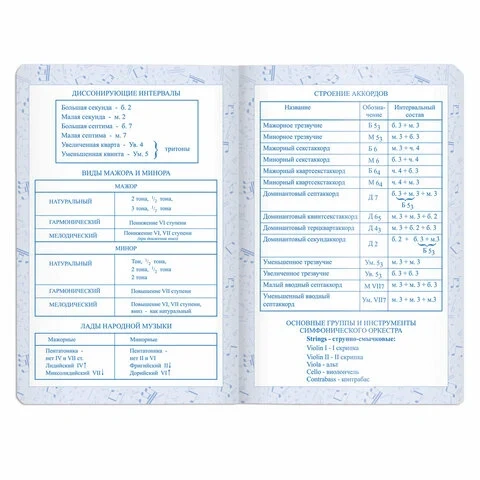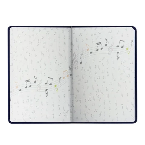 Внутренний блок изготовлен из белой офсетной бумаги повышенной плотности 70 г/м2. Содержит 48 листов для ведения записей и справочной информацией - длительности нот, интервалы, знаки в тональностях, ключи и пр. Обложка выполнена в черном цвете из экокожи - презентабельного и износоустойчивого материала. Элементы дизайна выполнены с помощью термотиснения и фольги. Для удобства использования дневник снабжен закладкой-ляссе.