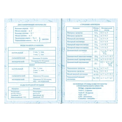 Внутренний блок изготовлен из белой офсетной бумаги плотностью 60 г/м2. Содержит 48 листов для ведения записей и справочную информацию: длительности нот, интервалы, знаки в тональностях, ключи и пр. Твердая обложка надежно защищает бумагу и долго сохраняет привлекательный внешний вид. Благодаря ламинации краски на изображении становятся более яркими и насыщенными, исключается возможное истирание рисунка. Выборочное лакирование эффектно подчеркивает отдельные элементы дизайна.