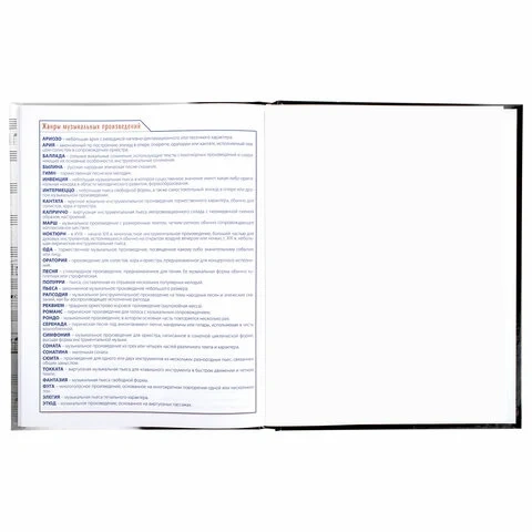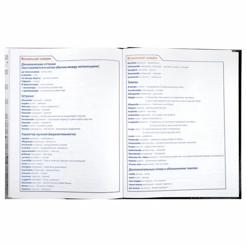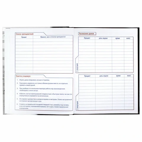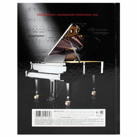 Дневник отлично подходит для занятий в музыкальной школе. Твердый переплет сохранит внешний вид изделия на долгое время. Внутренний блок: офсет 60 г/м2, 2-х цветная печать. Содержит словарь музыкальных терминов, справочный материал.