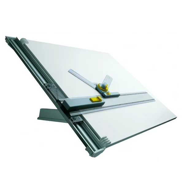 Чертежная доска с пластиковым покрытием со всех сторон. Устройство для наклонной установки доски. Съемная рейсшина с поворотной чертежной головкой.