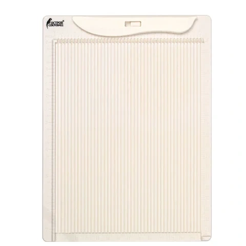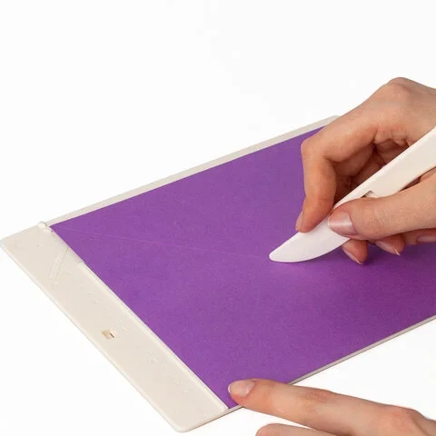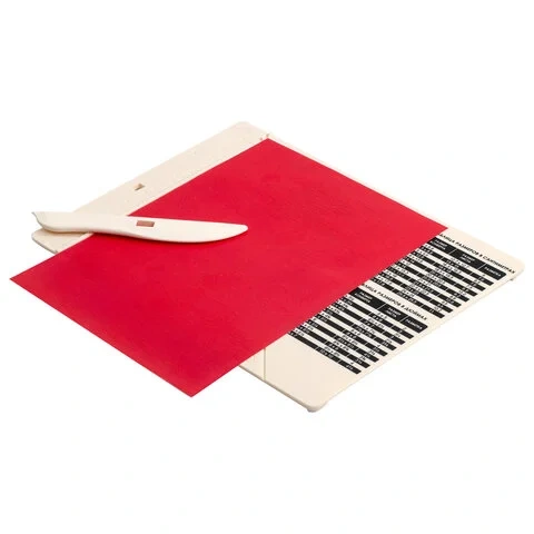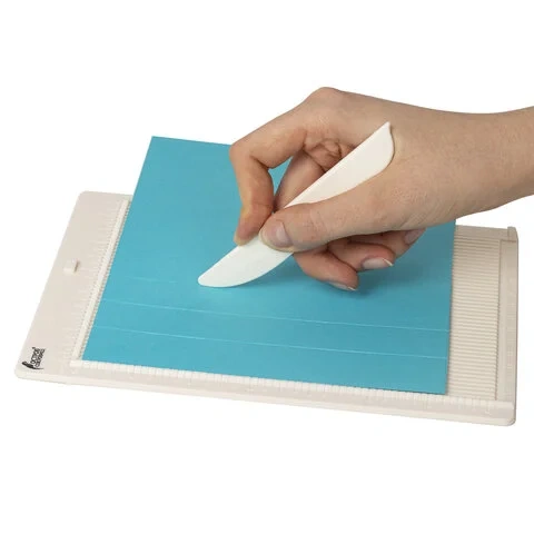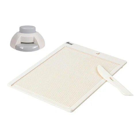 В набор входит прочная доска для биговки из АБС-пластика размером 16х21,5 см с разметкой в сантиметрах и дюймах, дырокол для скругления угла и создания выемок, палочка для биговки, трафарет для тиснения и подробная инструкция на обратной стороне доски.