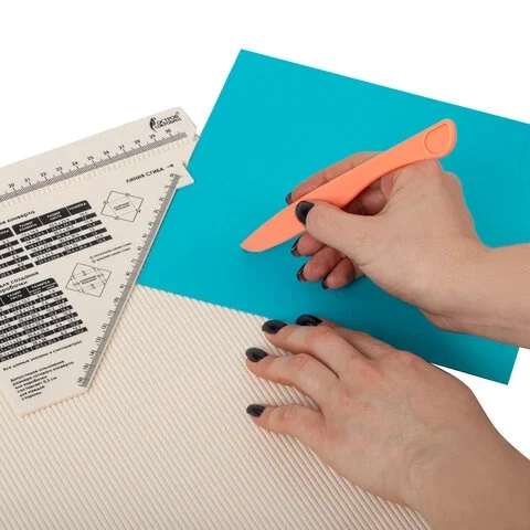 В набор входит прочная доска для биговки из АБС-пластика размером 33х34,6 см (размер рабочей поверхности составляет 30,5х30,5 см) с разметкой в сантиметрах, линейка-треугольник с инструкцией, палочка для биговки размером 14,5 см, а также подробная инструкция с понятными картинками на обратной стороне упаковки.