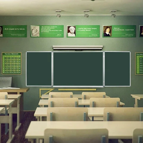 Рабочие поверхности доски предназначены для письма и рисования мелками, а металлическая поверхность позволяет размещать информацию при помощи магнитов. Состоит из 3-х элементов: центральная односторонняя секция – 100х150 см, двусторонние боковые секции – каждая по 100х75 см. Элементы крепления и полка для принадлежностей входят в комплект. Цвет: зеленый.