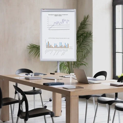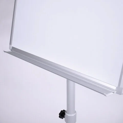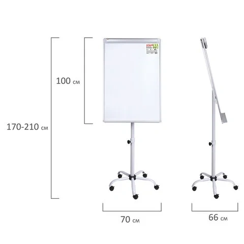 Белое лаковое покрытие предназначено для письма специальными маркерами для белой доски. Металлическая поверхность позволяет размещать объявления при помощи магнитов. Размер доски – 70х100 см. Регулируется по высоте от 170 см до 210 см. Устанавливается на пятилучии. В комплект входит лоток для аксессуаров. Блокнот крепится при помощи двух пластиковых подвижных крючков. Перед началом работы необходимо удалить защитную пленку с рабочей поверхности доски-флипчарта.