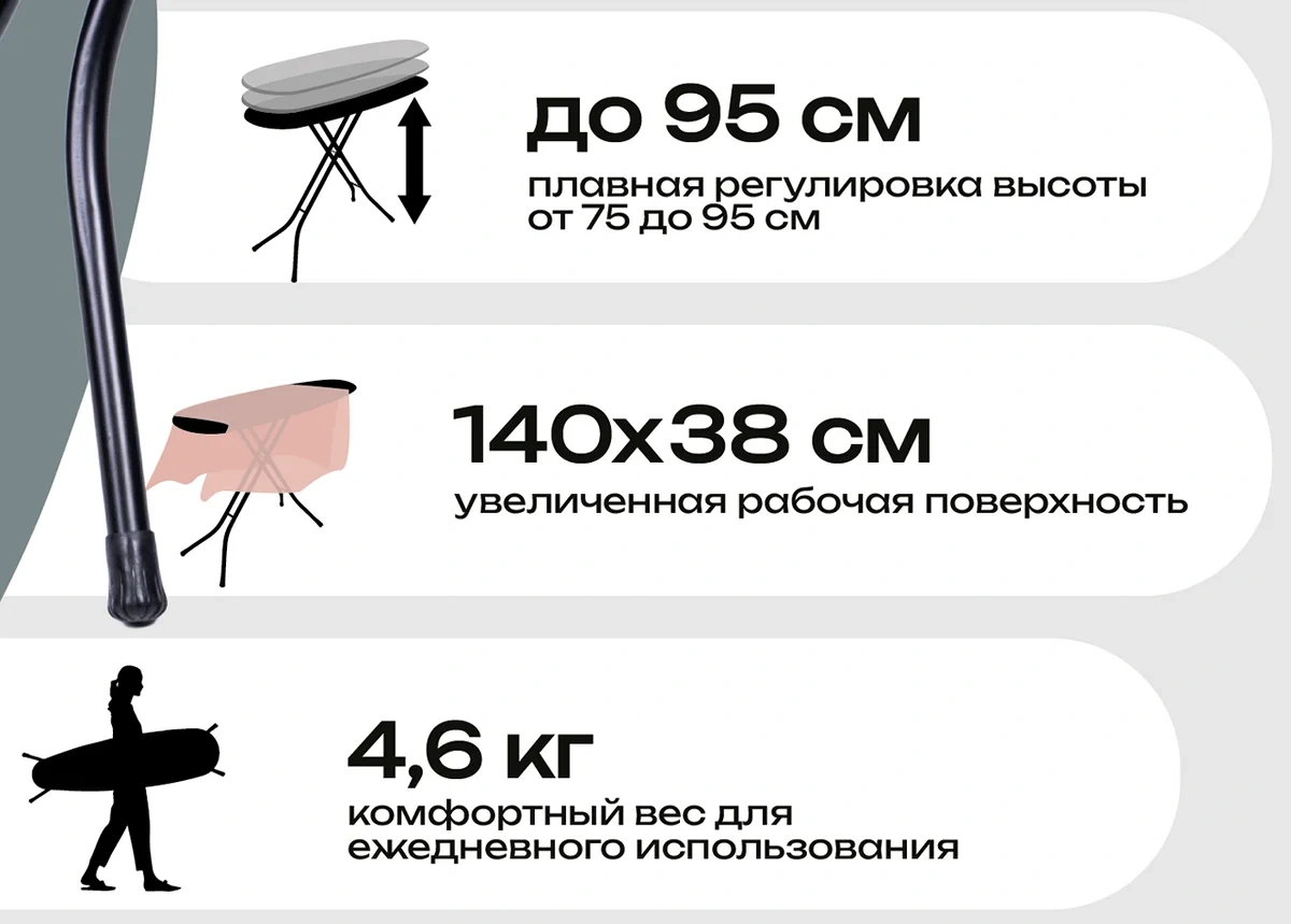 Доска гладильная 140*38см, основа стола - моноблок, электростатическая порошковая покраска, увеличенная поверхность для глажения за счет отсутствия подставки под утюг, устойчивые ножки (диаметр трубы 25), регулировка высоты 70-90см.