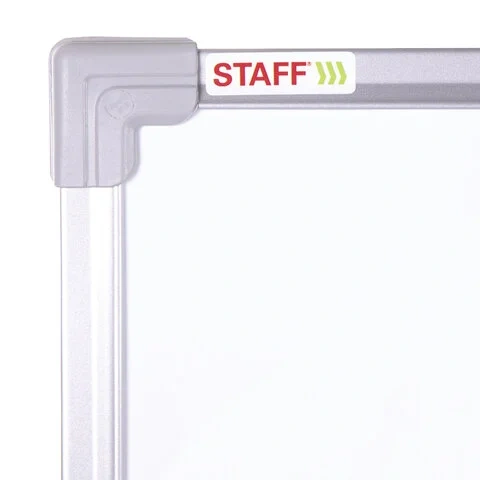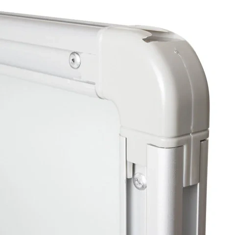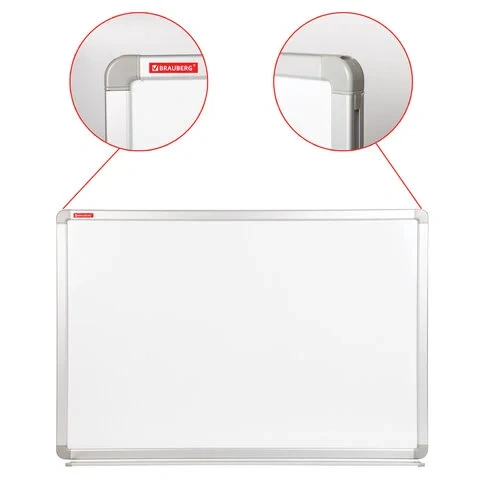 Доска обрамлена металлическим профилем серебристого цвета и скреплена пластиковыми уголками. В комплект входят крепления для размещения доски на стене. Для удаления защитной пленки необходимо потянуть за верхний свободный угол, после чего пленка легко отойдет от рабочей поверхности. При необходимости можно провести вдоль рамы канцелярским ножом для удаления остатков пленки.