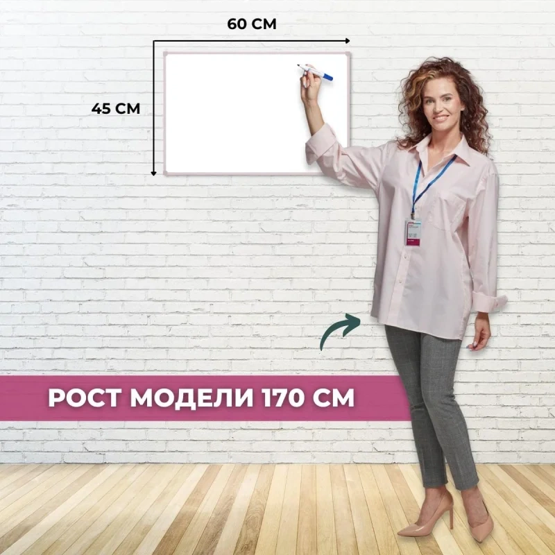 Доска оснащена скрытым креплением к стене с использованием четырёх пластиковых кронштейнов и комплектуется набором для крепежа и полочкой для маркеров. Размер рабочей поверхности доски составляет 41.8×55.8 см. Благодаря утончённой раме из ПВХ шириной 11 мм доска имеет увеличенное рабочее пространство и облегчённую конструкцию.