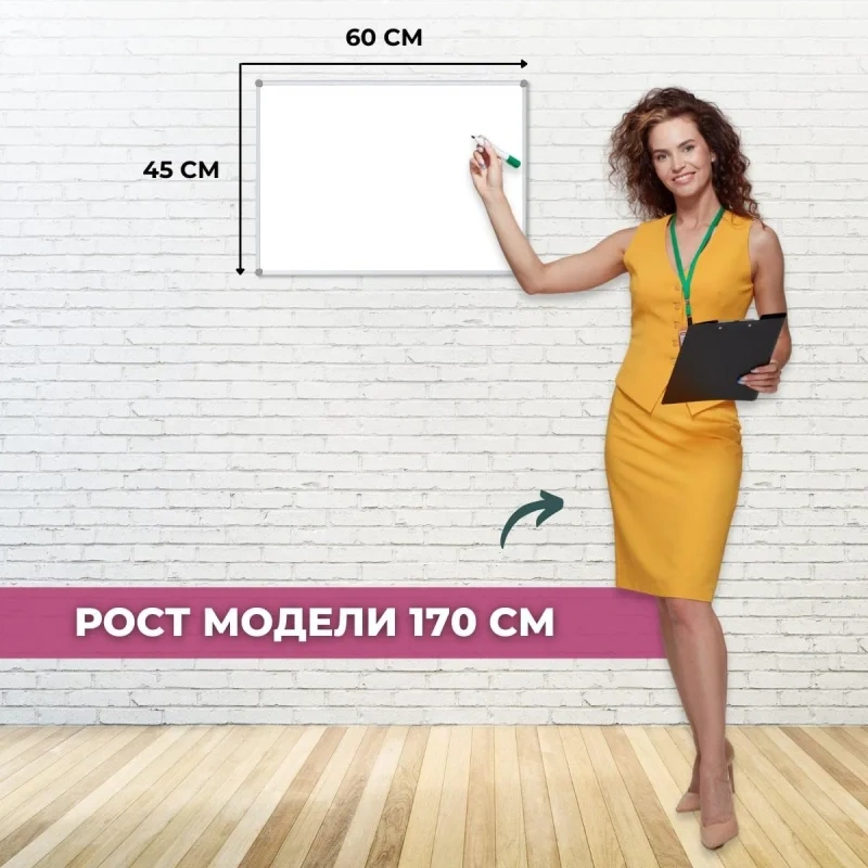 Магнитно-маркерная доска предназначена для настенного крепления. Она оснащена полочкой для маркеров, что удобно для организации рабочего пространства. Рабочая поверхность доски белая, что позволяет использовать её с маркерами для магнитно-маркерных досок и прикреплять информацию с помощью магнитов. Для удаления записей рекомендуется использовать специальные губки-стиратели в комбинации с чистящим спреем для более тщательной очистки.