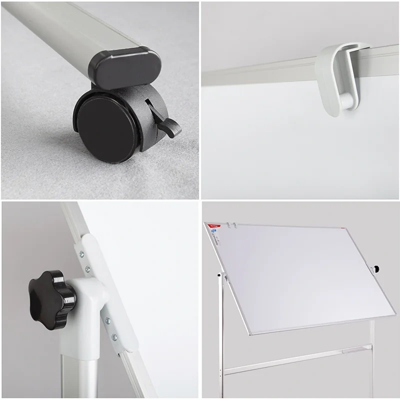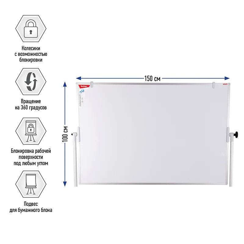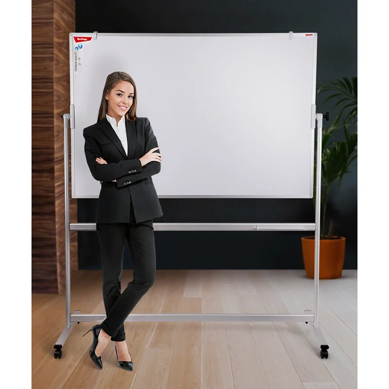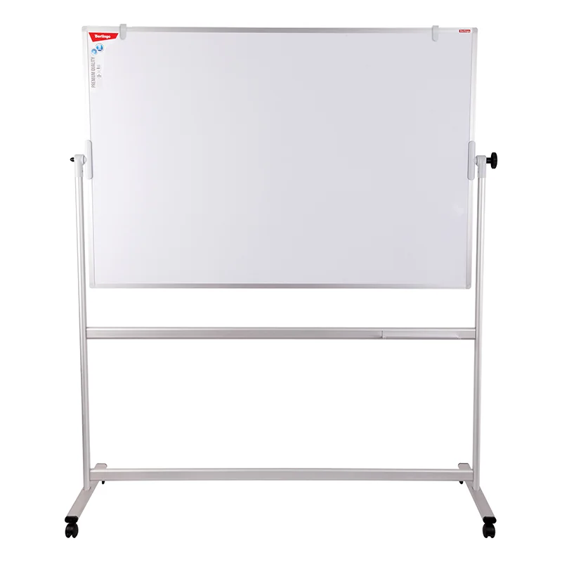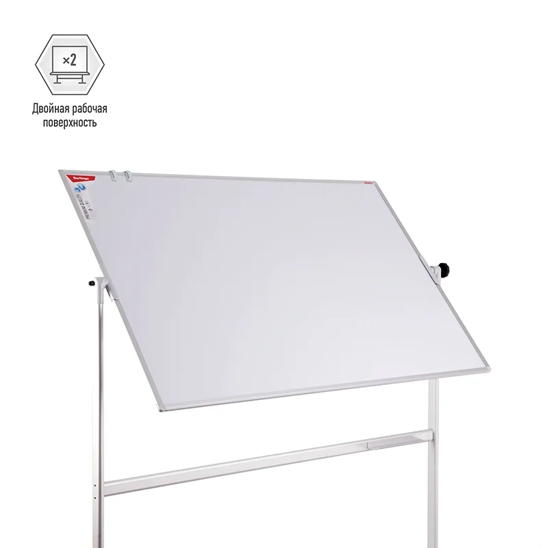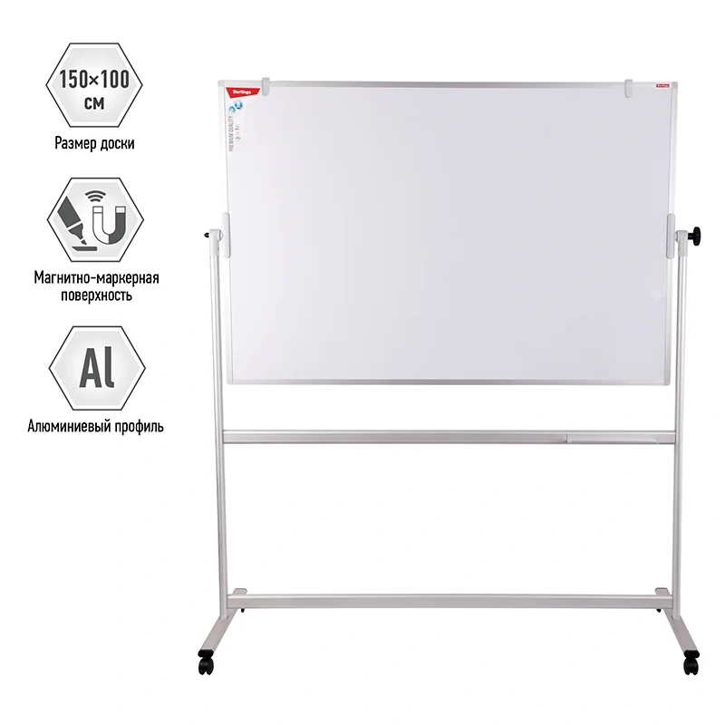 Магнитно-маркерная доска размера 150*100 см в алюминиевой рамке на мобильной подставке позволяет представить аудитории значительно большее количество данных, чем стандартные модели, закрепляемые на стене. Информация может наноситься на обе стороны доски, которая за счет крепление к раме вращается в горизонтальной плоскости на 360 градусов. Может фиксироваться в любом положении. Снабжена лотком для аксессуаров и тормозной системой для предотвращения случайного движения. Поставляется в комплекте со сборочными инструментами и подвесом для флипчарта, который дополнительно расширяет возможности продукта.