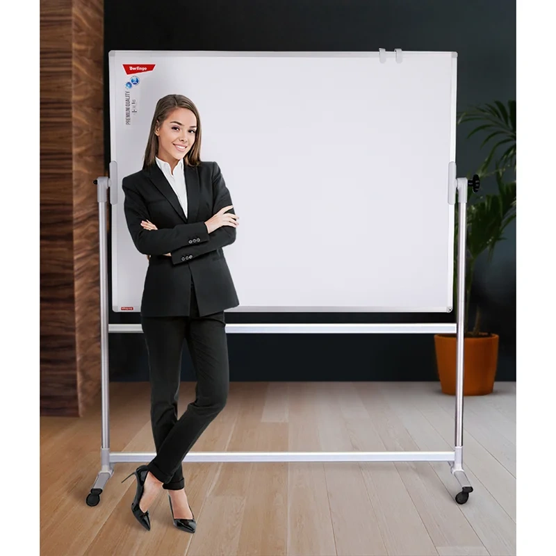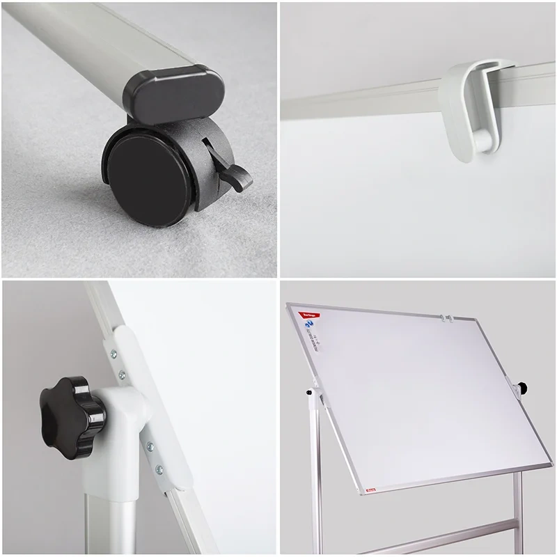 Магнитно-маркерная доска размера 90*120 см в алюминиевой рамке на мобильной подставке позволяет представить аудитории значительно большее количество данных, чем стандартные модели, закрепляемые на стене. Информация может наноситься на обе стороны доски, которая за счет крепление к раме вращается в горизонтальной плоскости на 360 градусов. Может фиксироваться в любом положении. Снабжена лотком для аксессуаров и тормозной системой для предотвращения случайного движения.