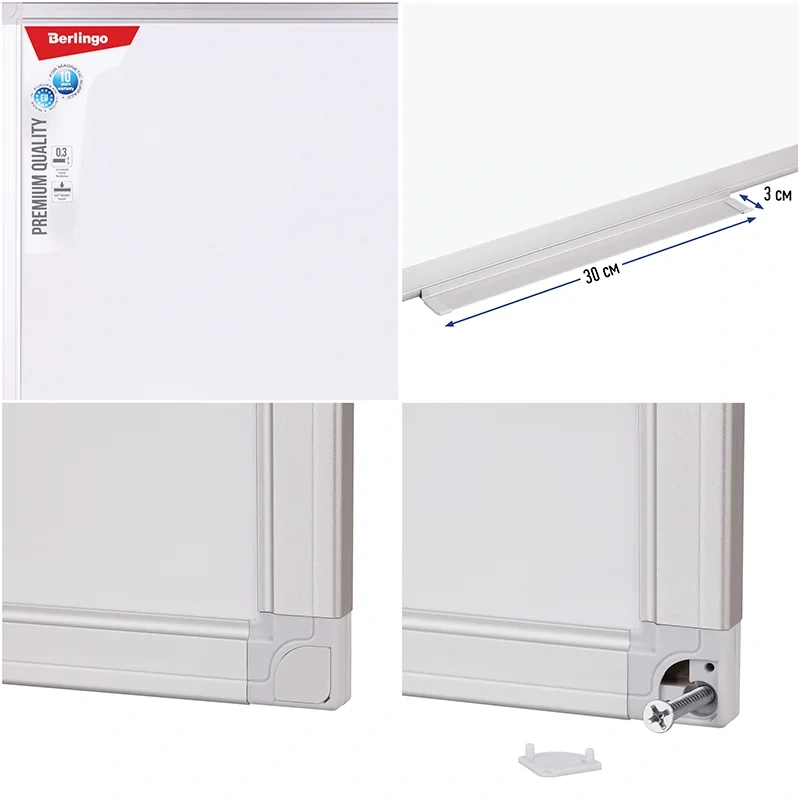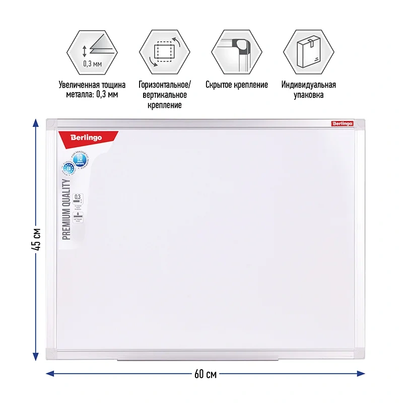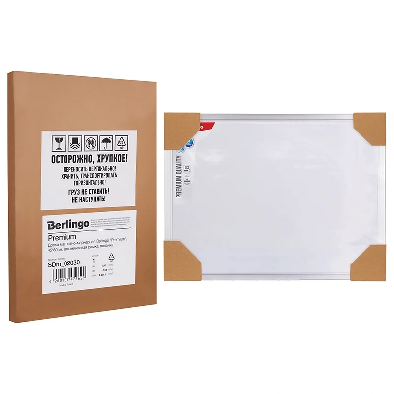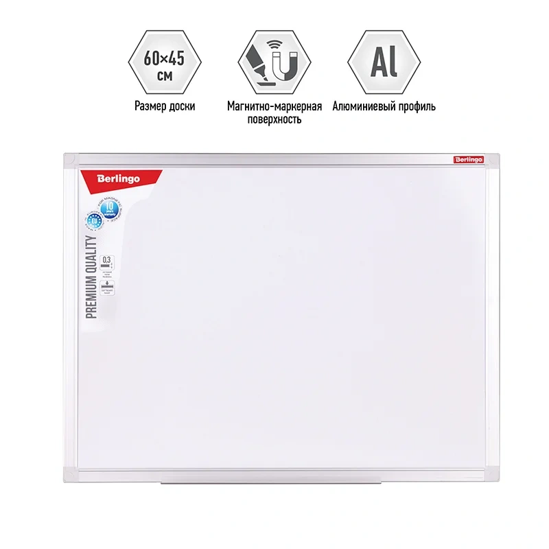 Доска магнитно-маркерная Berlingo Premium качества, 45*60 мм. Увеличеннная толщина магнитно-маркерной поверхности, ДВП основа. Полочка для аксессуаров и комплект креплений - в комплекте. Индивидульно упакована в пленку, в коробке - 8 штук. Гарантия на магнитно-маркерную поверхность - 10 лет.