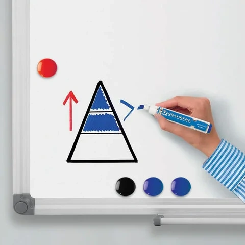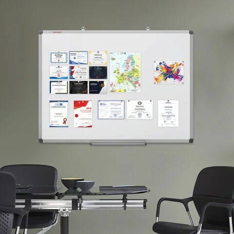 Лаковое покрытие предназначено для письма специальными маркерами для белой доски, а металлическая поверхность позволяет размещать информацию при помощи магнитов. Доска размером 100х150 см имеет укрепленные пластиковые уголки, которые позволяют скрыть места крепления к стене. Профиль придает изделию дополнительную прочность и современный стильный внешний вид. Элементы крепления входят в комплект. Для защиты рабочей поверхности доски на нее нанесена защитная пленка. Перед началом работы – удалить защитную пленку. При должном уходе за рабочей поверхностью доски при помощи чистящей жидкости-спрея и стирателей BRAUBERG поверхность магнитно-маркерной доски прослужит более 10 лет.