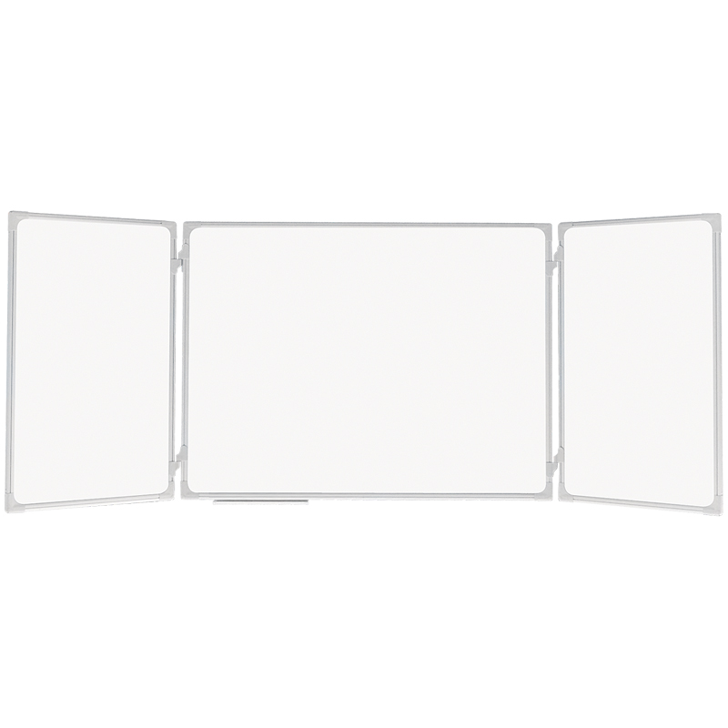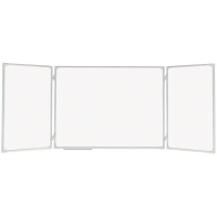 Трехэлементная настенная магнитно-маркерная доска предназначена для проведения презентаций и ведения практических занятий в различных группах. Лаковое покрытие предназначено для письма специальными маркерами для белой доски, а металлическая поверхность позволяет размещать информацию при помощи магнитов. Трехэлементная магнитно-маркерная доска имеет укрепленные пластиковые уголки, которые позволяют скрыть места крепления к стене. Алюминиевый профиль придает изделию дополнительную прочность и современный стильный внешний вид. Полочка для аксессуаров, держатели для бумажных блоков и элементы крепления входят в комплект. Центральная односторонняя секция – 180х120 см. Двусторонние боковые секции – 90х120 см каждая. Боковые секции крепятся к центральной при помощи шарниров. При должном уходе за рабочей поверхностью доски, поверхность магнитно-маркерной доски прослужит не менее 10 лет.